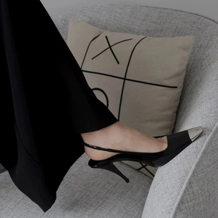 细跟性感小方头包头凉鞋 女漆皮黑色铁头女鞋 高跟鞋 rose朴彩英同款