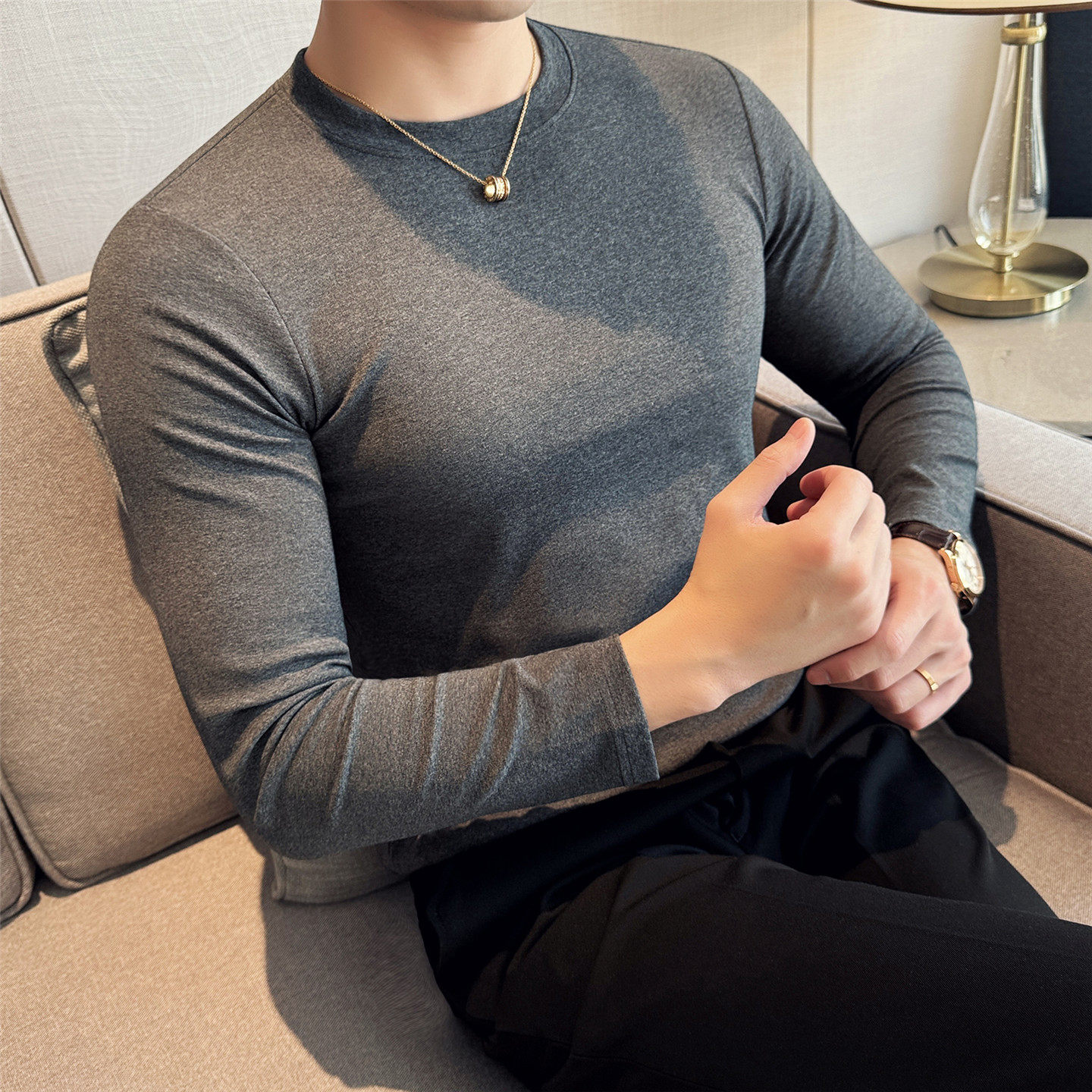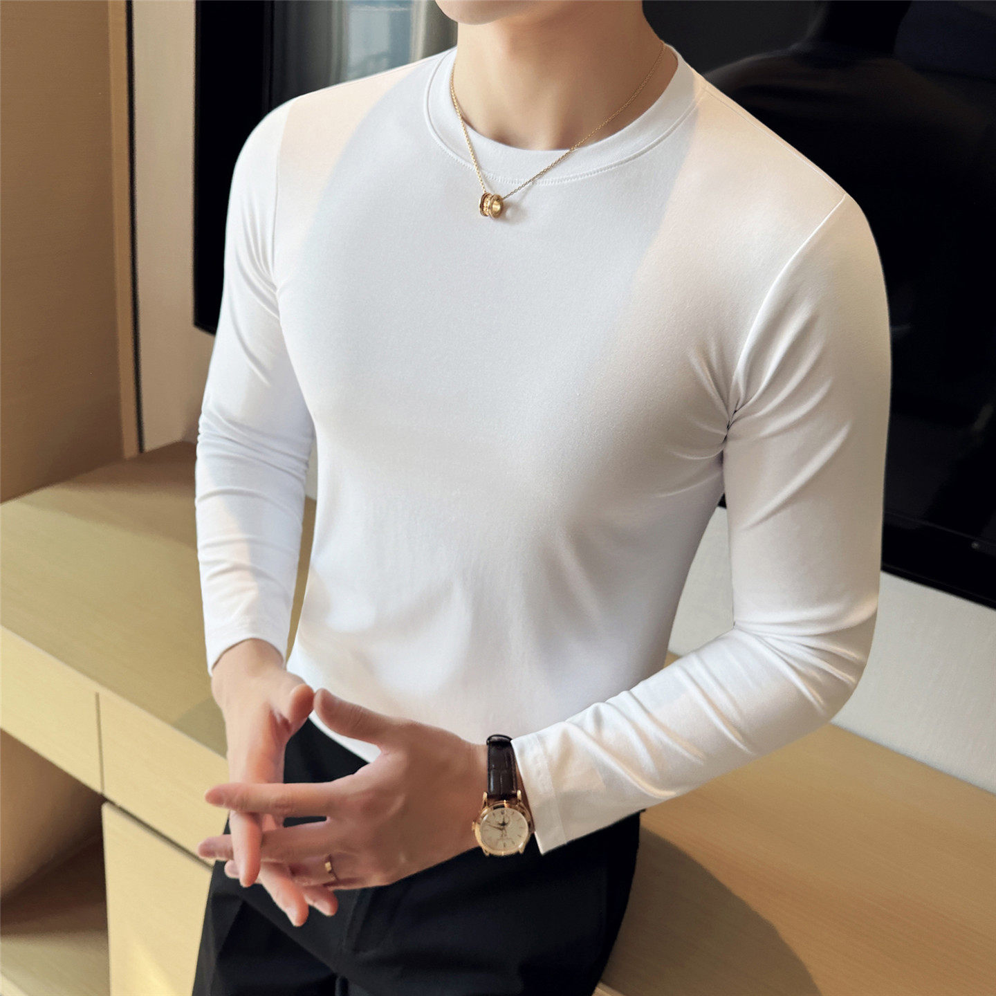 内搭白色打底衫 纯棉T恤圆领短袖 男小领口 长袖 2026高级感弹力修身