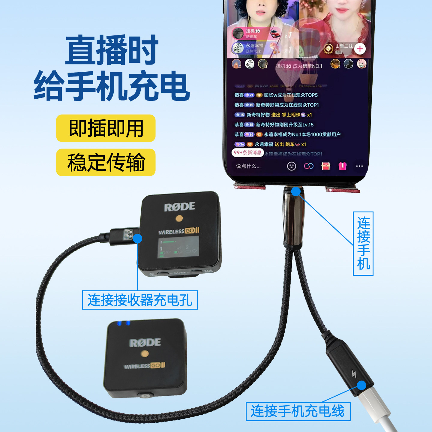 罗德GO Mic一分二苹果手机边充电边直播连接线无线麦克风Lightning转Type ME大疆DJI C转接头器 PRO Ktele