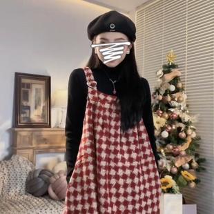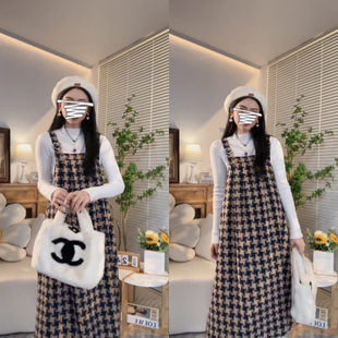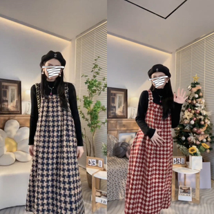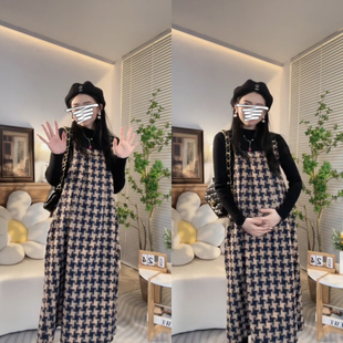 格子背带裙2024新款 孕妇春季 圆领针织上衣中长款 长袖 休闲百搭 套装