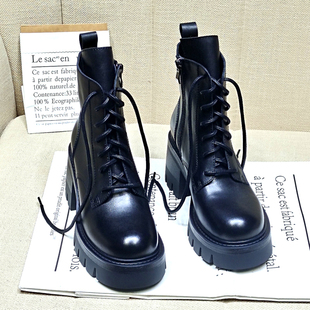 2025秋冬新款 高跟短靴女真皮英伦风粗跟系带马丁靴女厚底短筒女靴