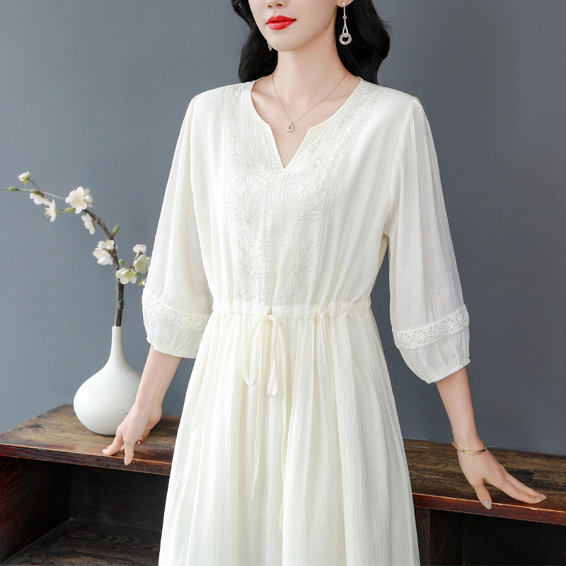 褶皱连衣裙女2025新款 高端气质显瘦收腰系带波西米亚白色仙气长裙