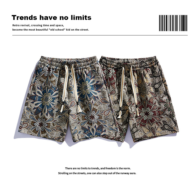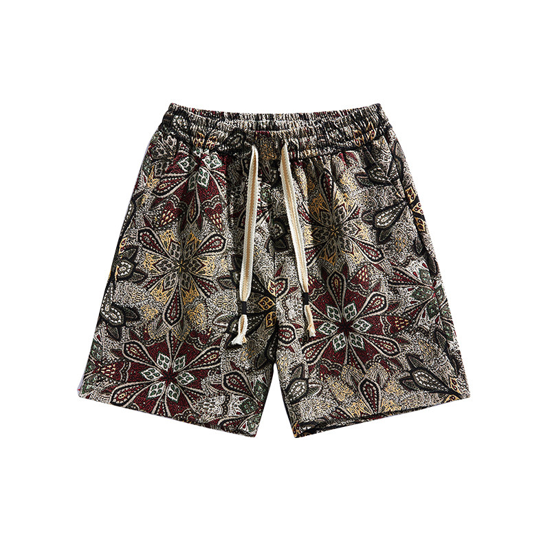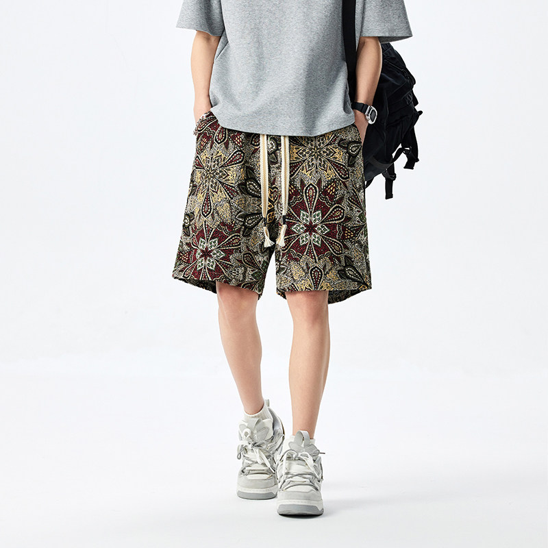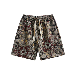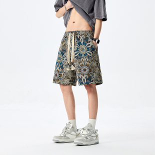 拼色宽松大学生跑步大花满印花休闲沙滩裤 男中裤 薄款 夏季 潮 五分裤
