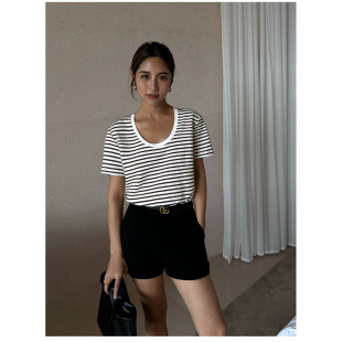 宽松韩版 NEVA t恤女春夏新款 条纹U领短袖 百搭休闲v领上衣