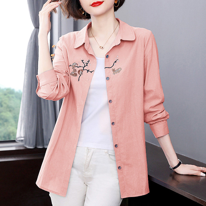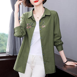 女装 中长款 2023年春秋新款 上衣大码 衬衣外套 洋气女士长袖 纯棉衬衫