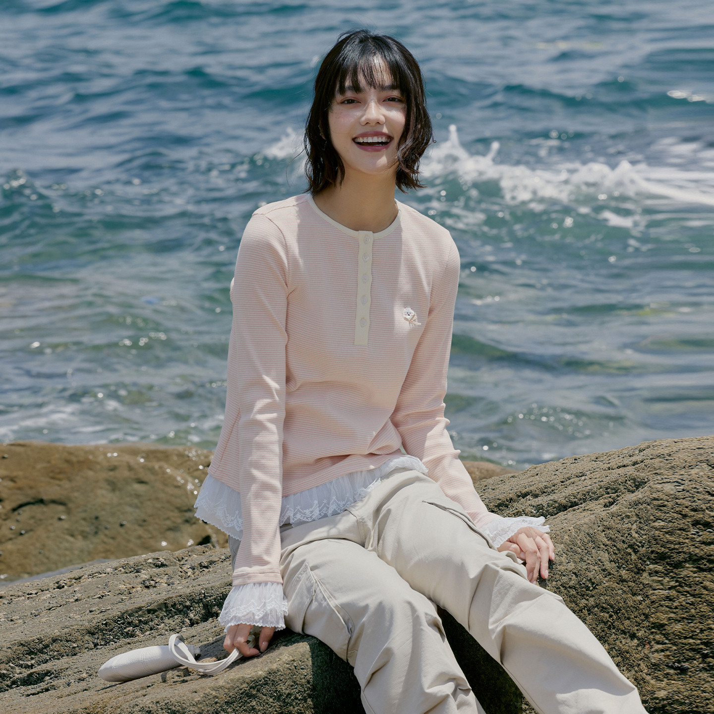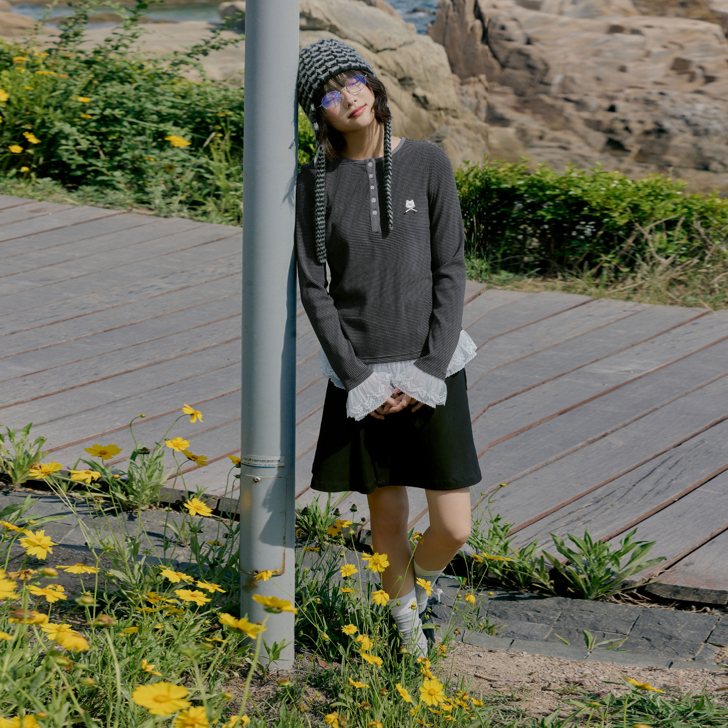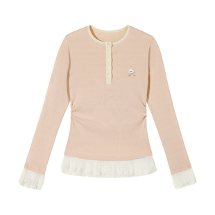 假两件蝴蝶结可爱小狗花边条纹亨利领T恤女上衣秋 女装 PSO Brand