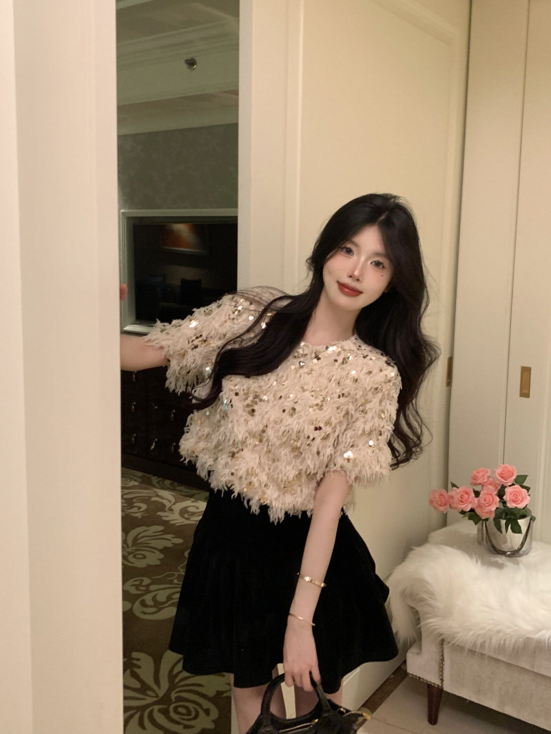 设计感别致绝美气质宽松短款 法式 2023新款 T恤女春季 上衣 亮片短袖