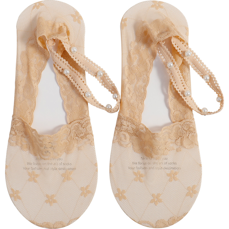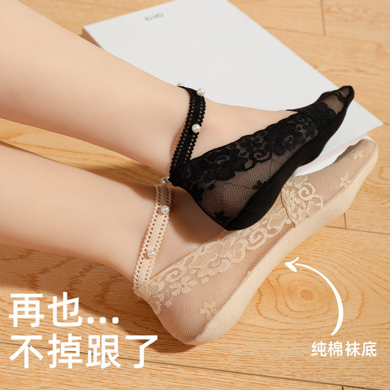 橙乙珍珠船袜子女纯棉底不掉跟蕾丝浅口吊带隐形袜夏季 防滑短袜子