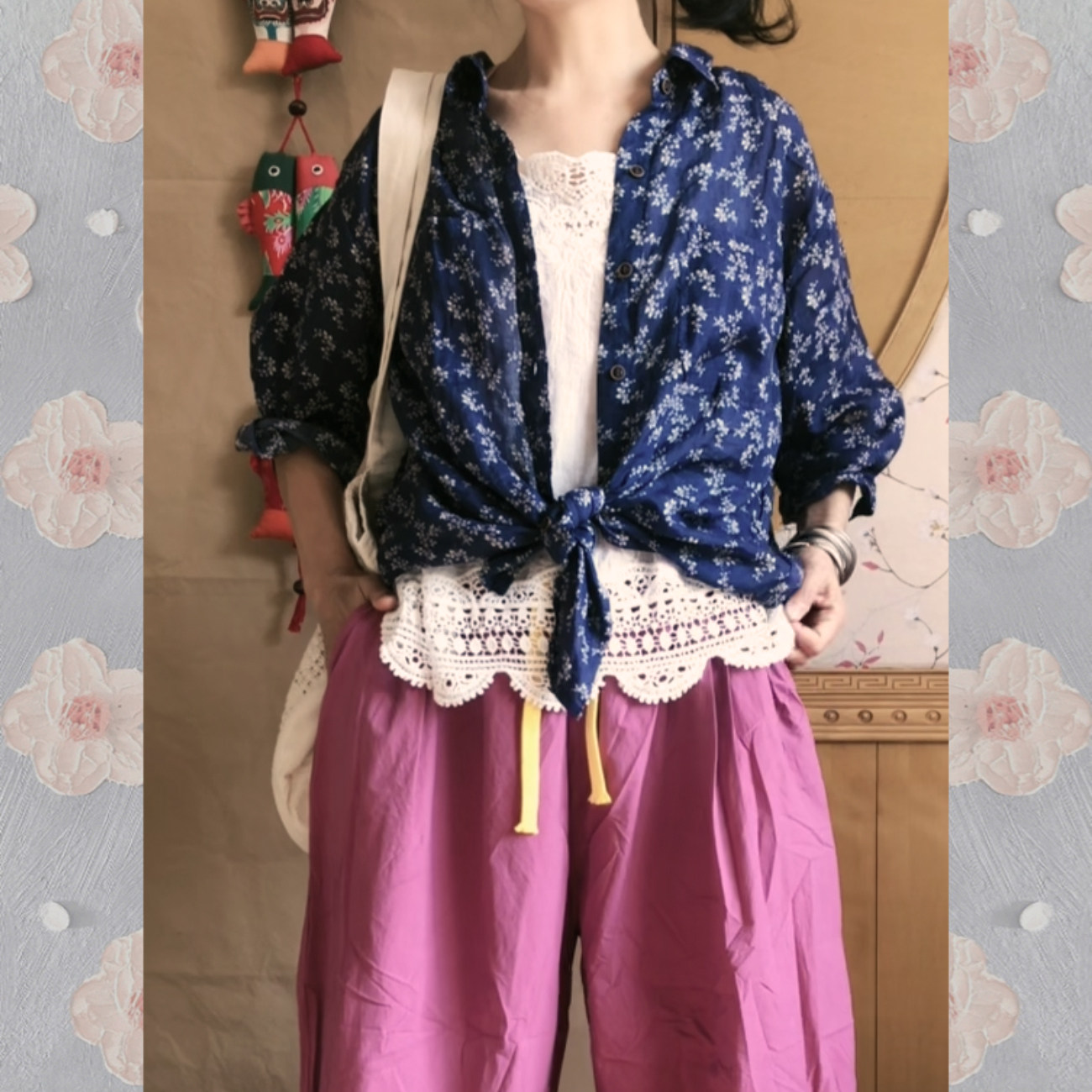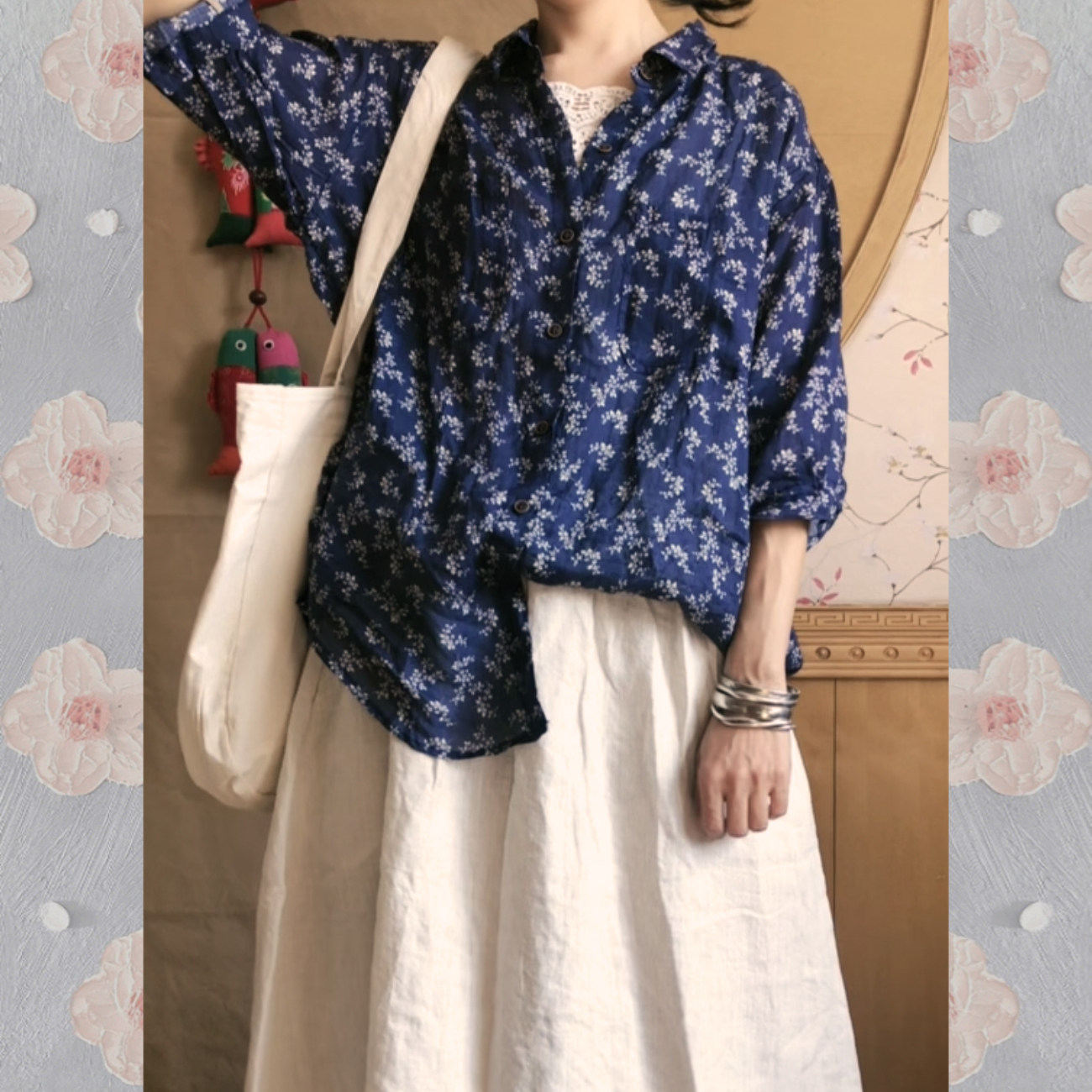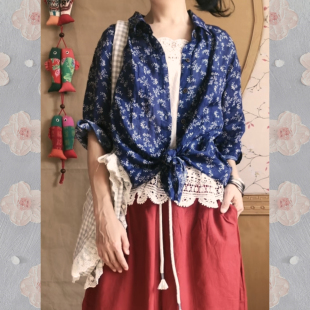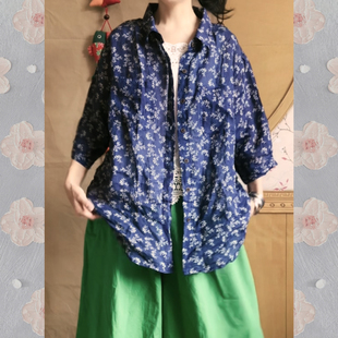 宽松超薄夏季 文艺复古风藏蓝小碎花苎麻衬衫 女装 单穿叠穿 L大码
