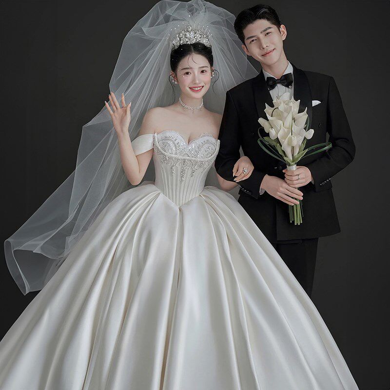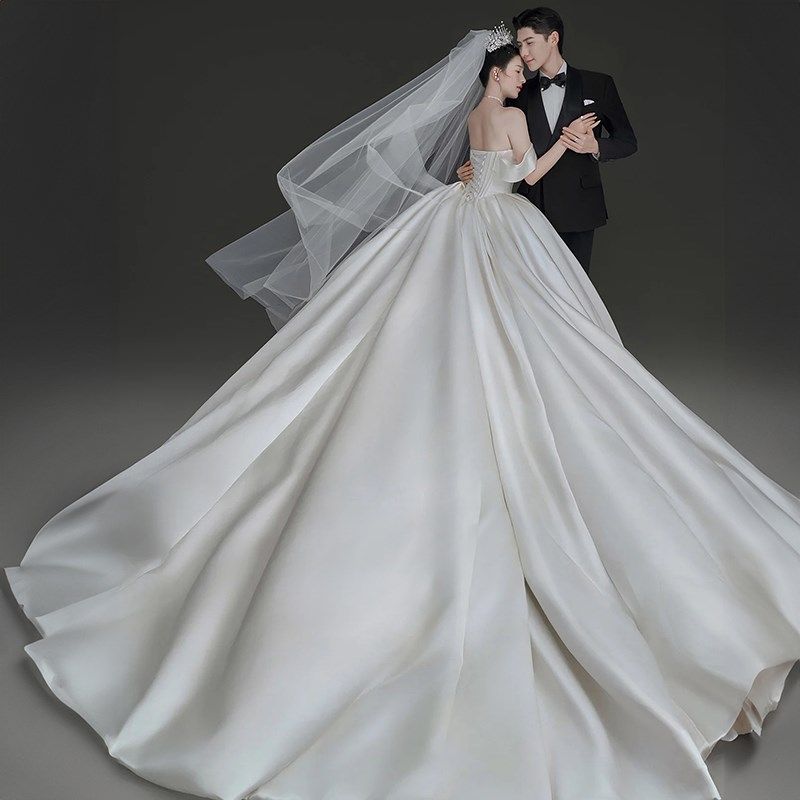 法式 新娘结婚出门纱轻奢质感012 缎面一字肩婚纱公主风2025新款