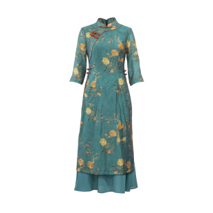 开叉裙子24R550 收腰显瘦时尚 如意风奥黛旗袍新款 连衣裙女洋气长款