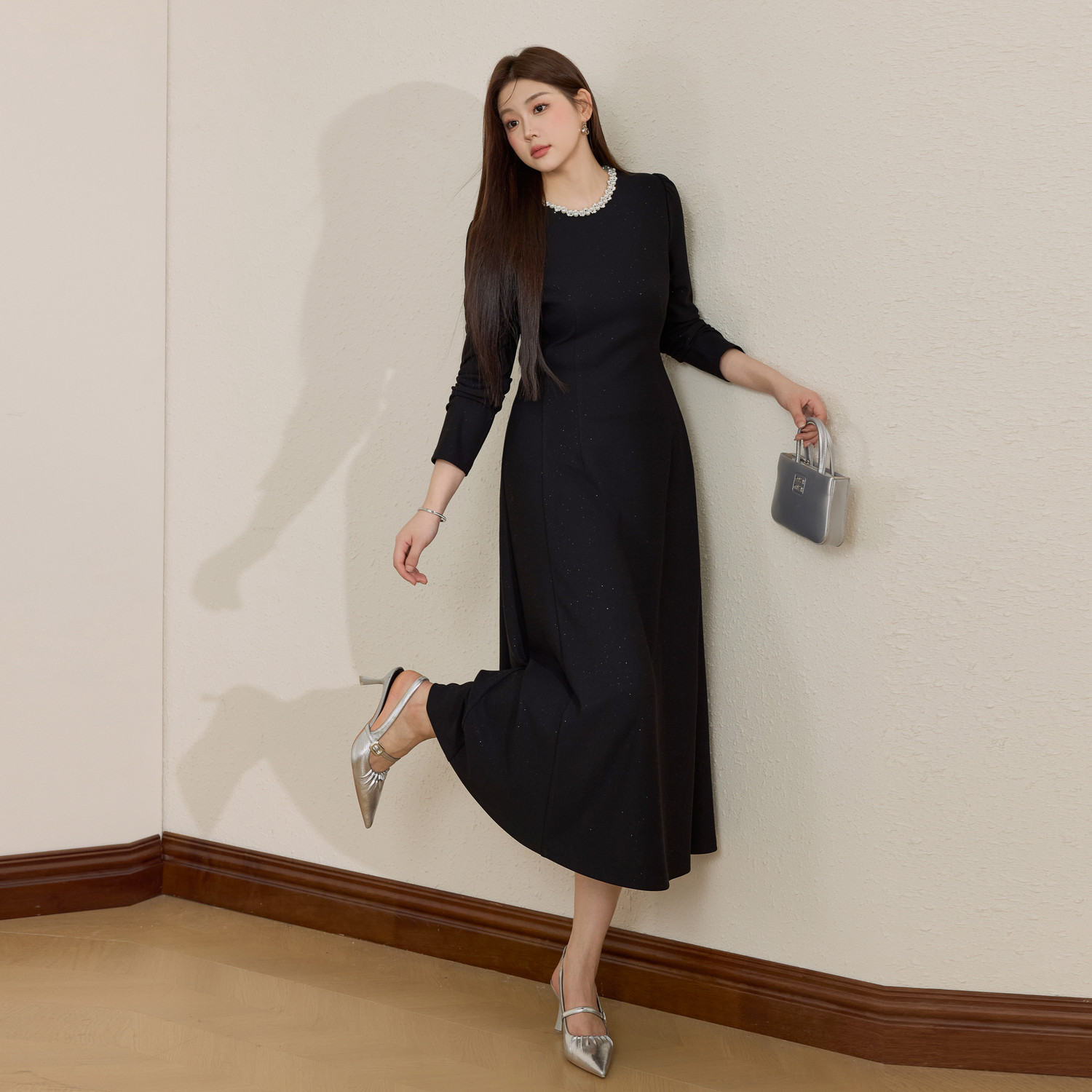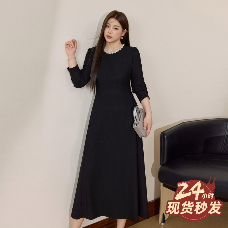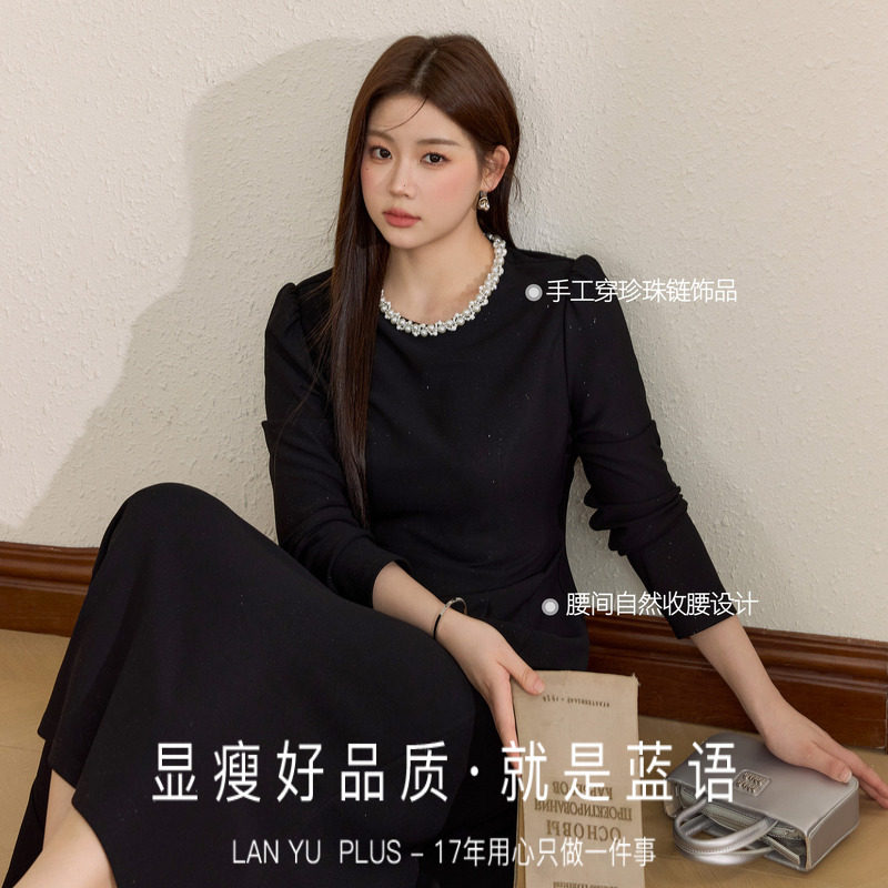 气质赫本风显瘦连衣裙掐腰显瘦长袖 女装 a字裙 蓝语黑天鹅大码 现货