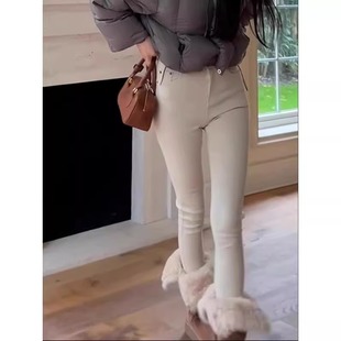 靴裤 小个子紧身弹力九分保暖小脚裤 女春秋2025新款 杏色加绒牛仔裤