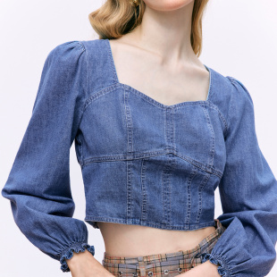 MOISSAC摩萨克100全棉高级法式 上衣女 复古露脐收腰牛仔小衫