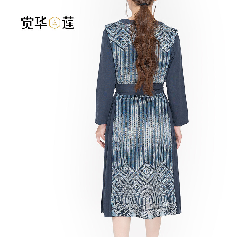 觉华莲连衣裙女2020年新款 轻熟风亚麻长裙中国风条纹碎花裙