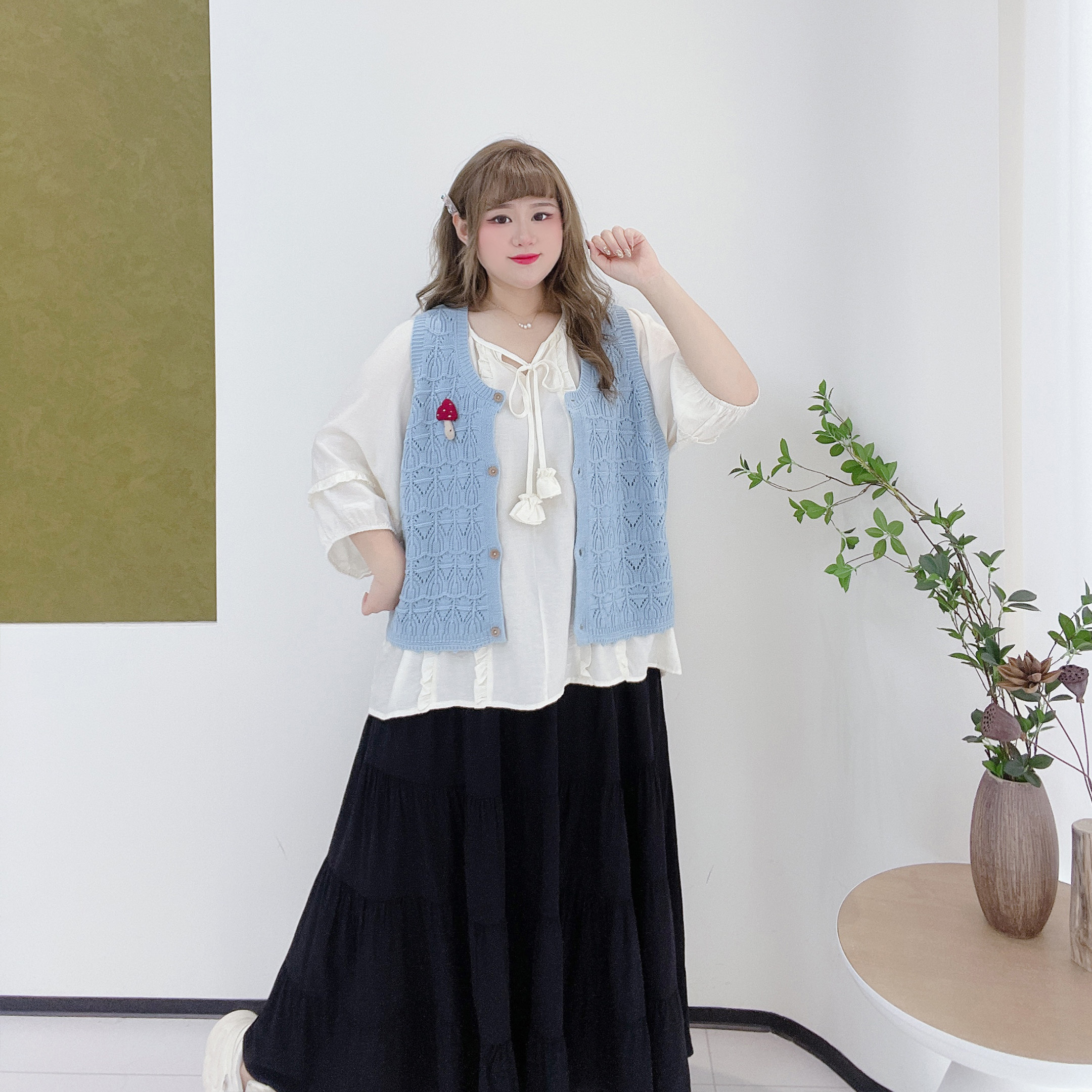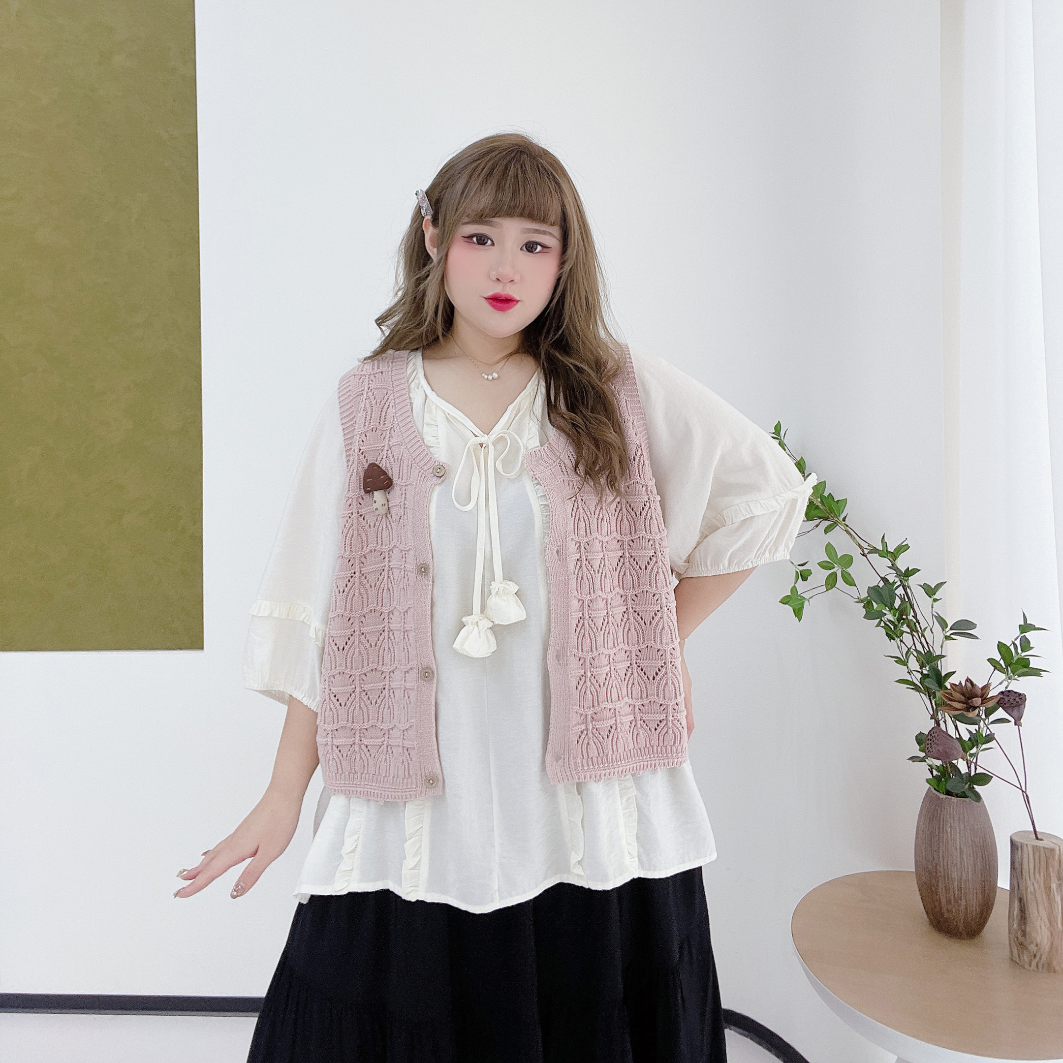 清新学院风韩版 2026春款 甜美可爱遮肉显瘦镂空叠穿马甲 女装 大码