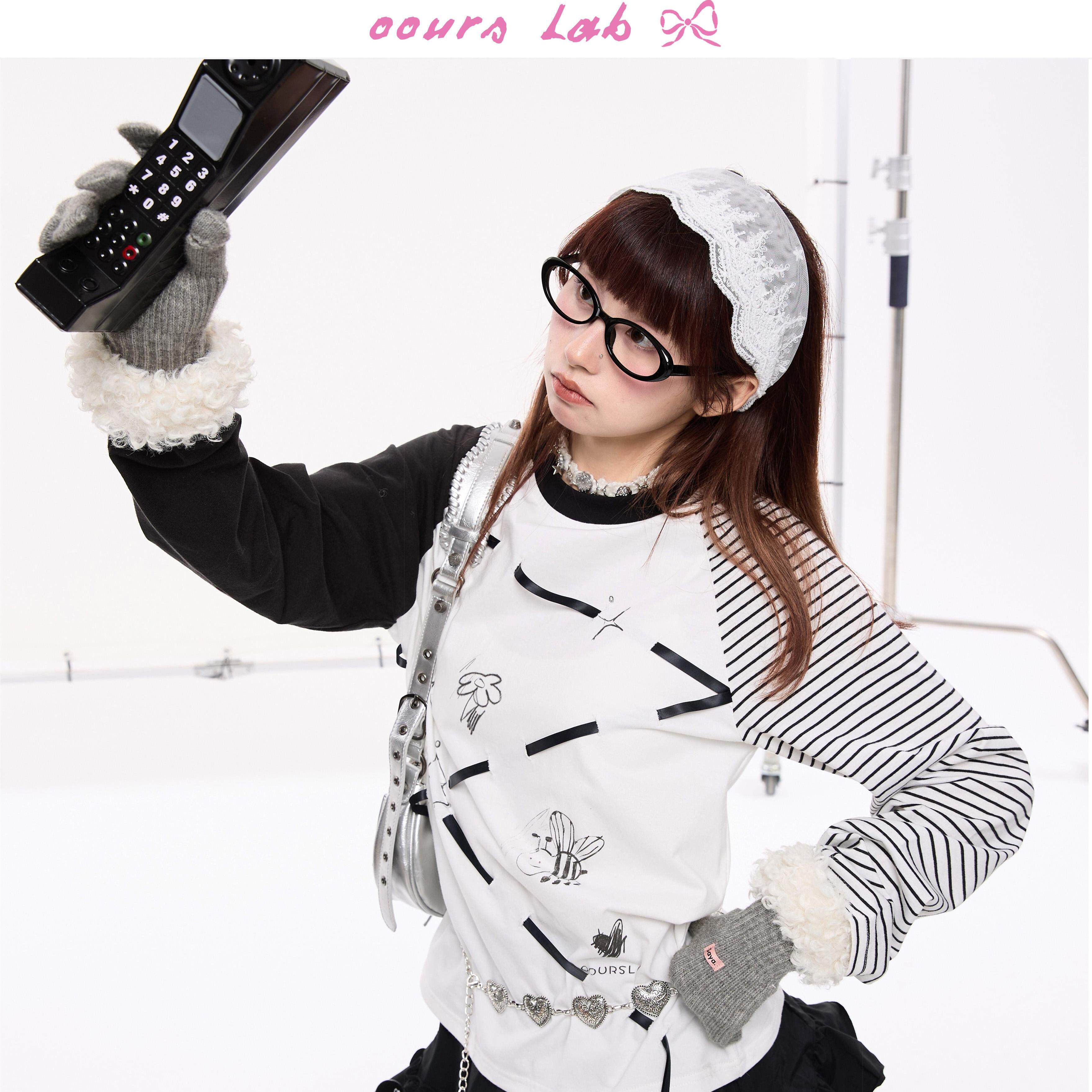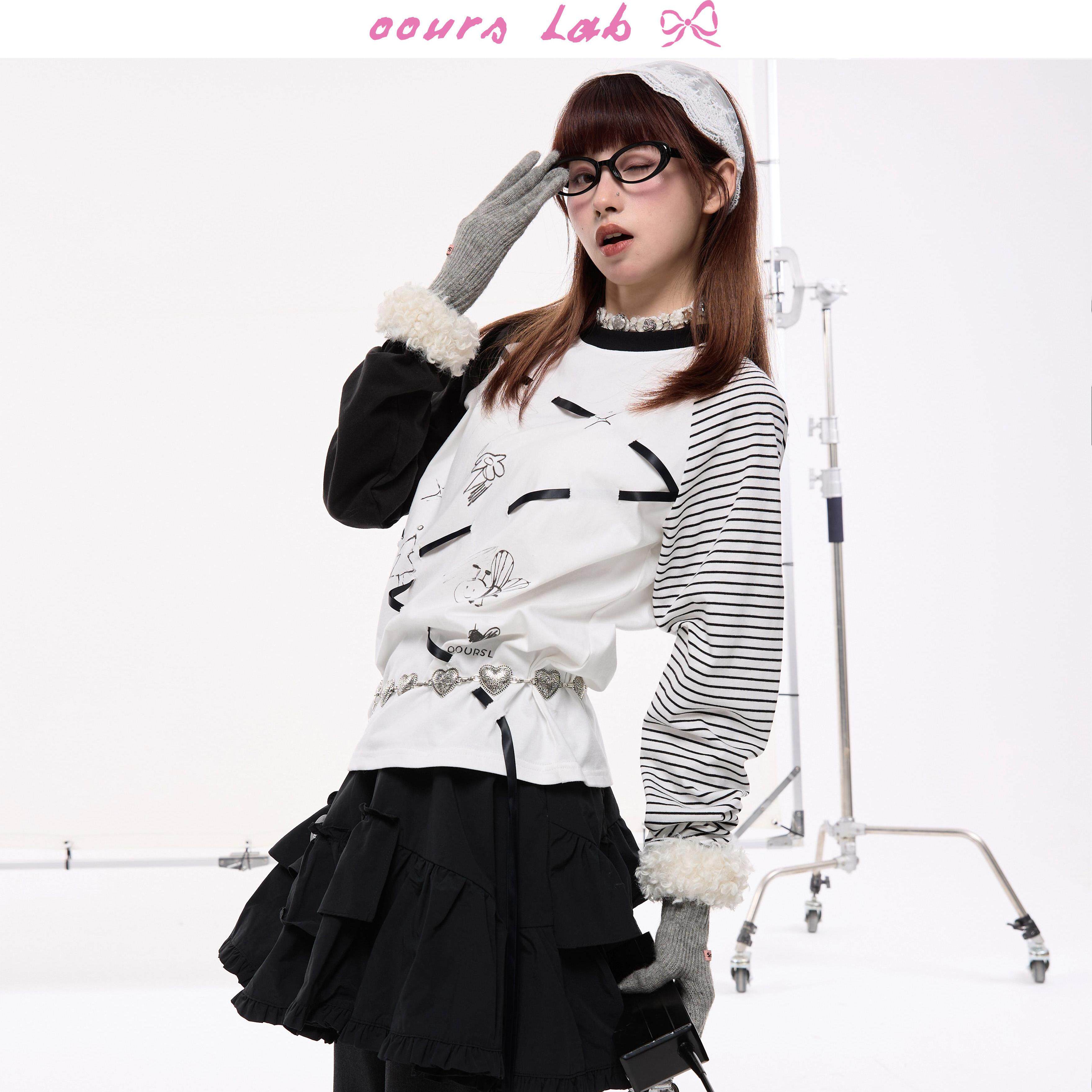 T恤女秋 长袖 OOURSLAB 原创趣味印花绑带条纹拼接撞色插肩袖