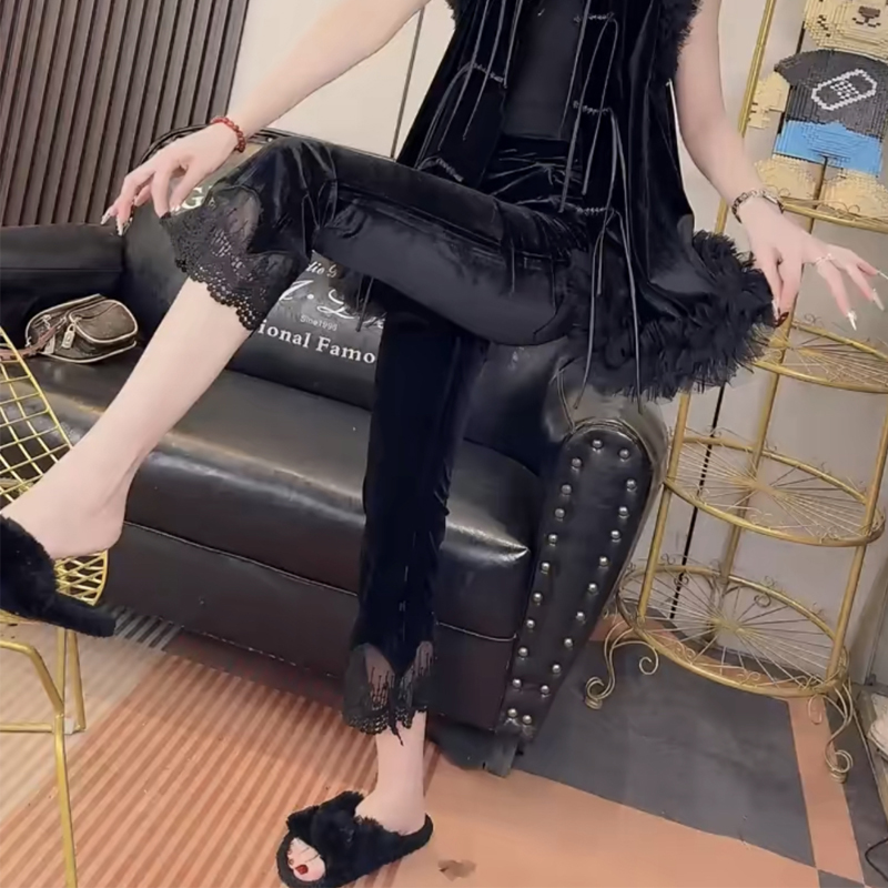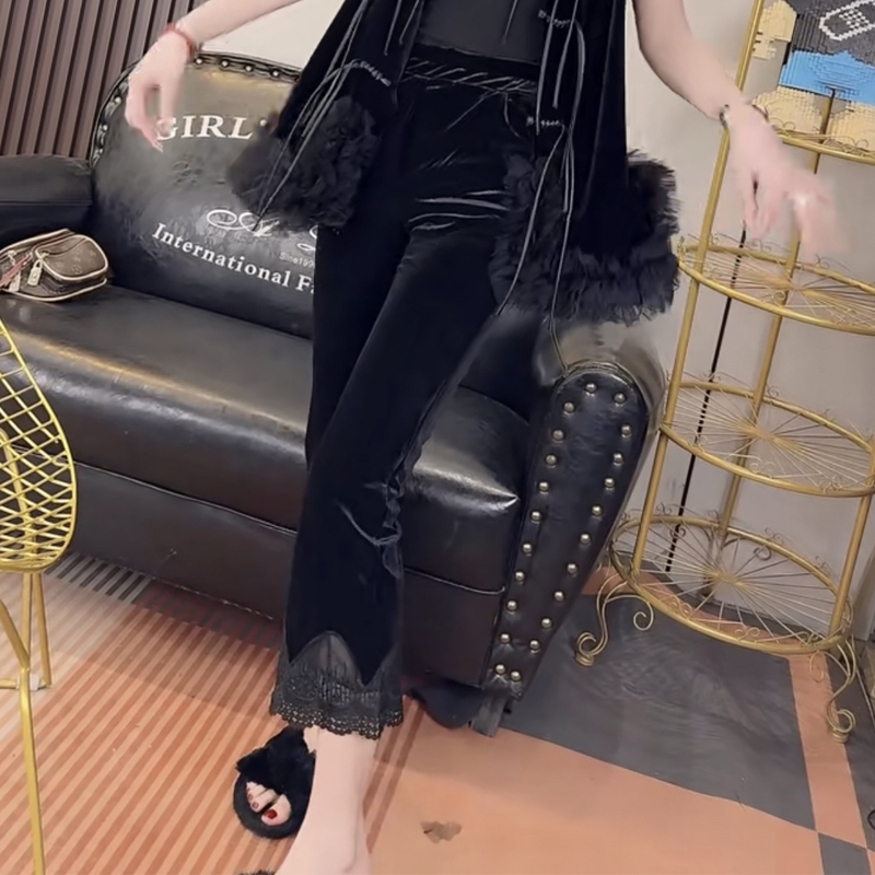 松紧腰显瘦九分裤 子女拼接蕾丝直筒裤 丝绒微喇叭裤 黑色2024春夏季