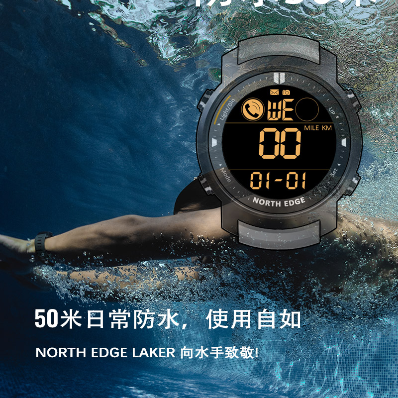 潮流户外运动高中青少年多功能防水防摔心率蓝牙电子表 男士 laker黑色 EDGE手表男学生新款 NORTH