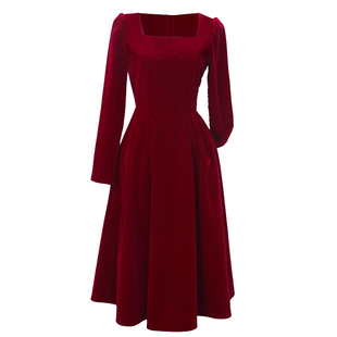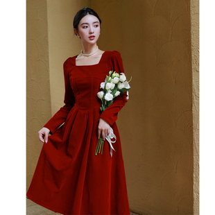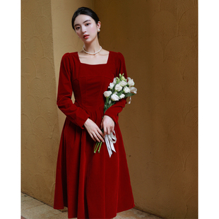 女 裙子秋冬季 JUJU定制法式 复古红色丝绒连衣裙显瘦高级感方领长袖