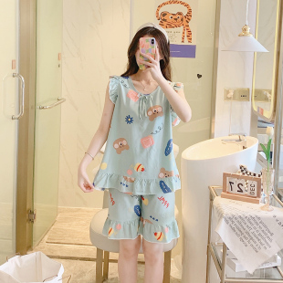 薄款 棉绸睡衣女夏季 印花两件套甜美清新人棉绵绸家居服女 短袖 夏款