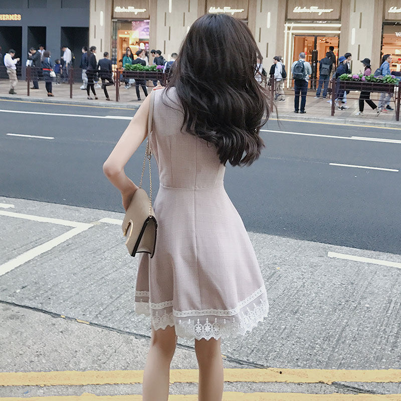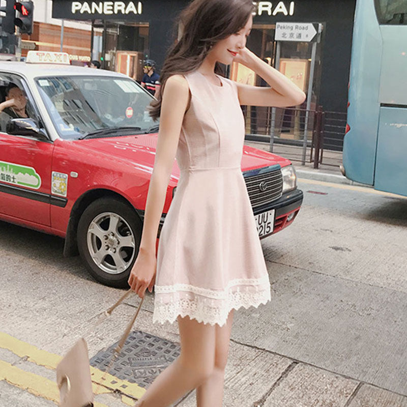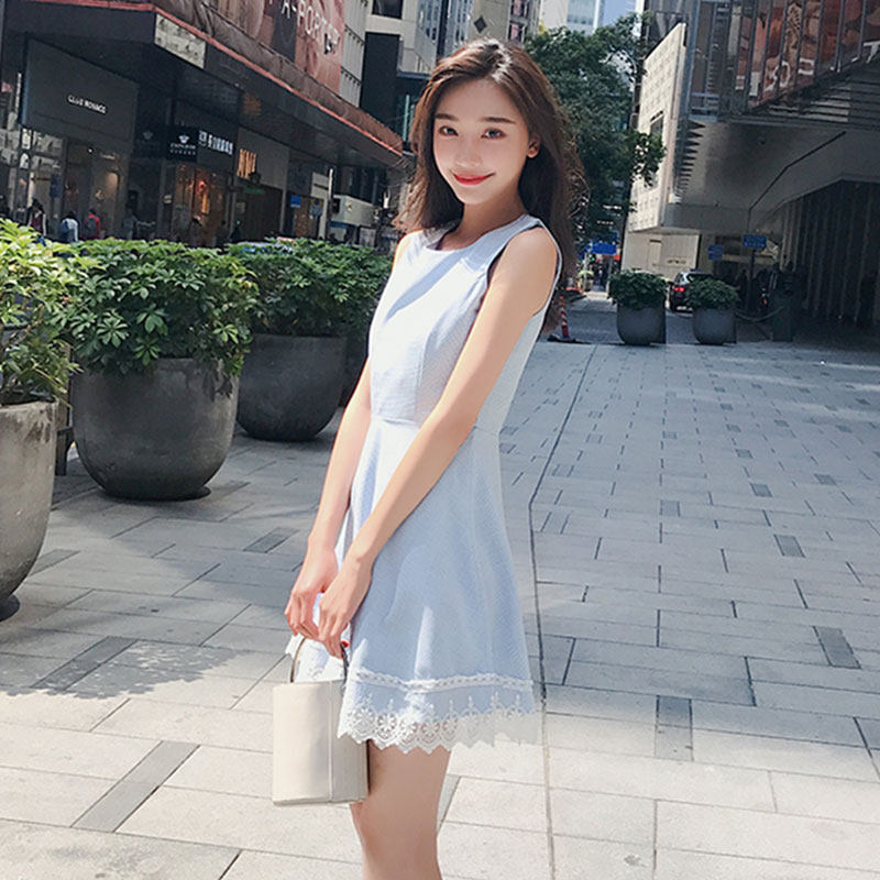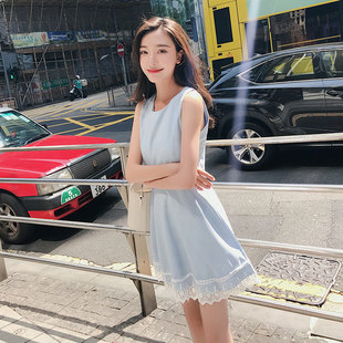 小清新连衣裙女士8128 收腰时尚 酷伽甜美无袖 蕾丝拼接夏季