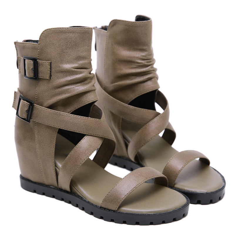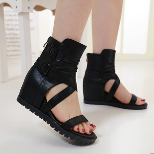 夏季 软底休闲高帮复古内增高一字带露趾罗马凉靴 女士高跟坡跟凉鞋