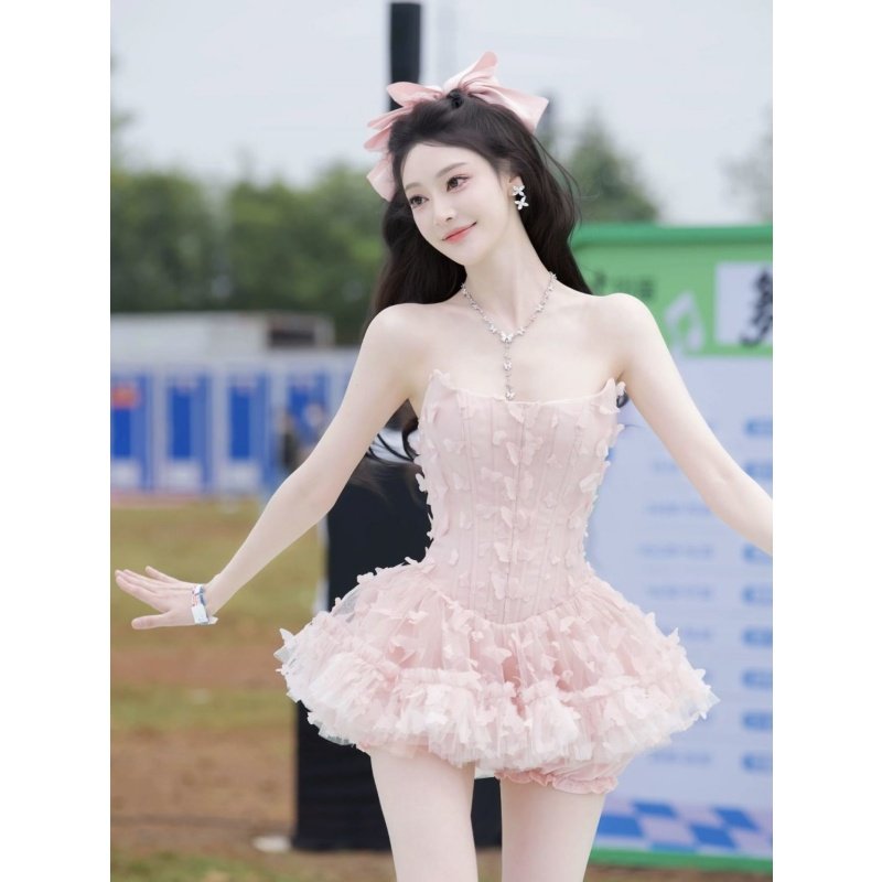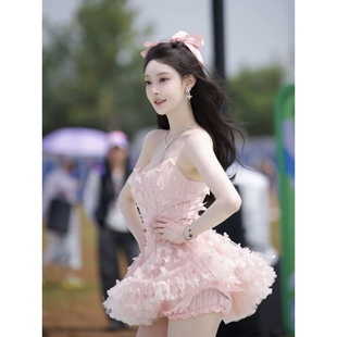 甜美可爱少女新款 蕾丝拼接吊带连衣裙蝴蝶结蛋糕裙小个子裙 女仆装