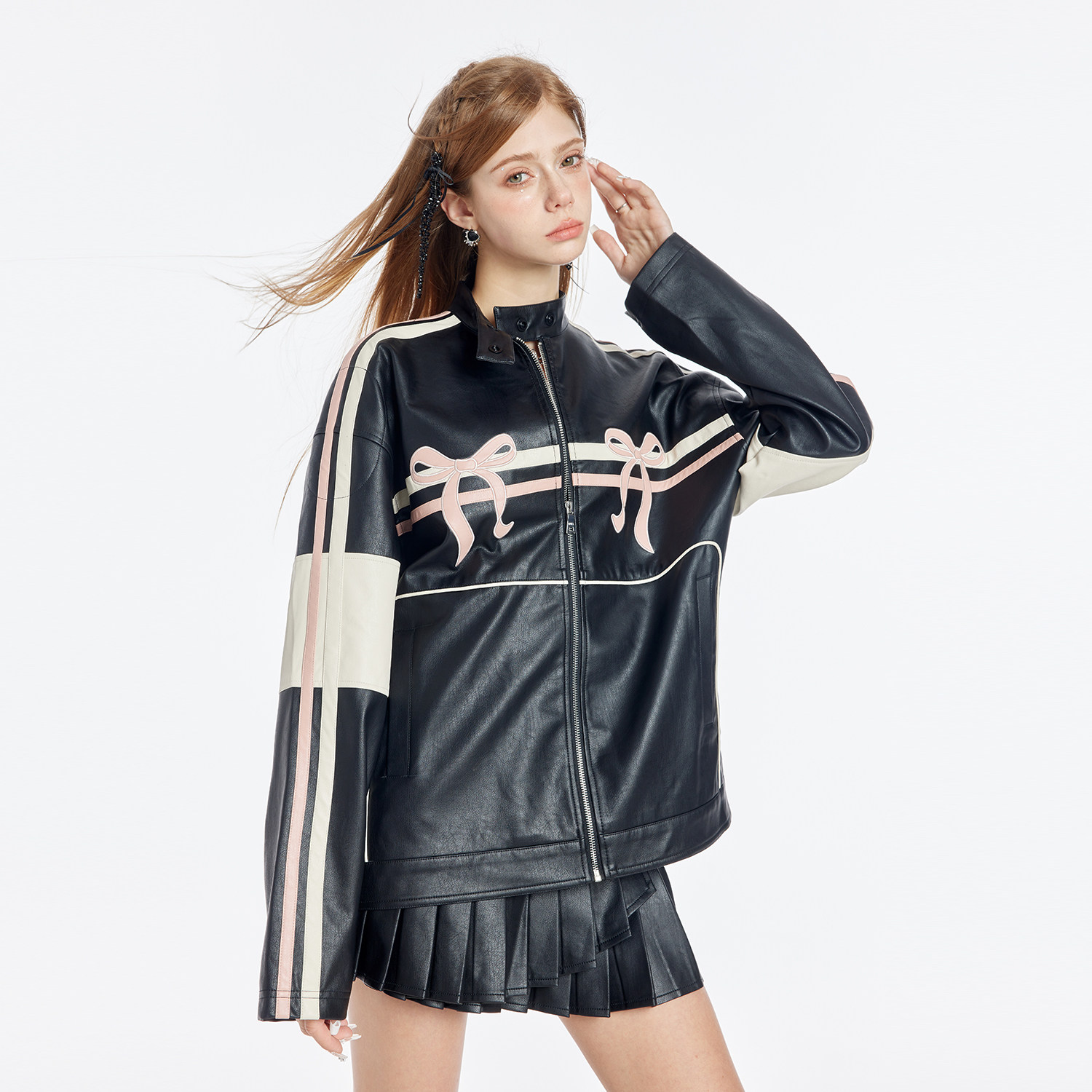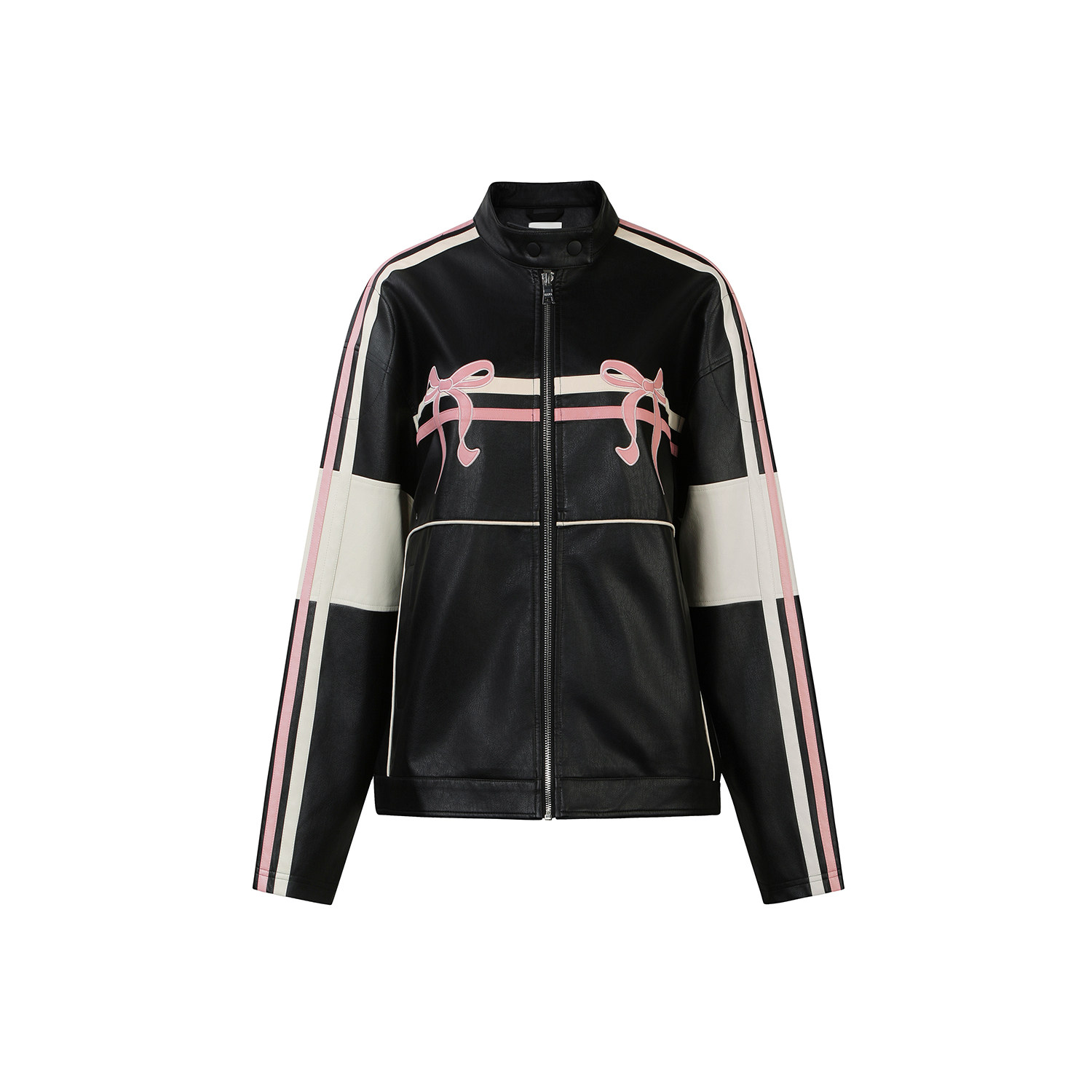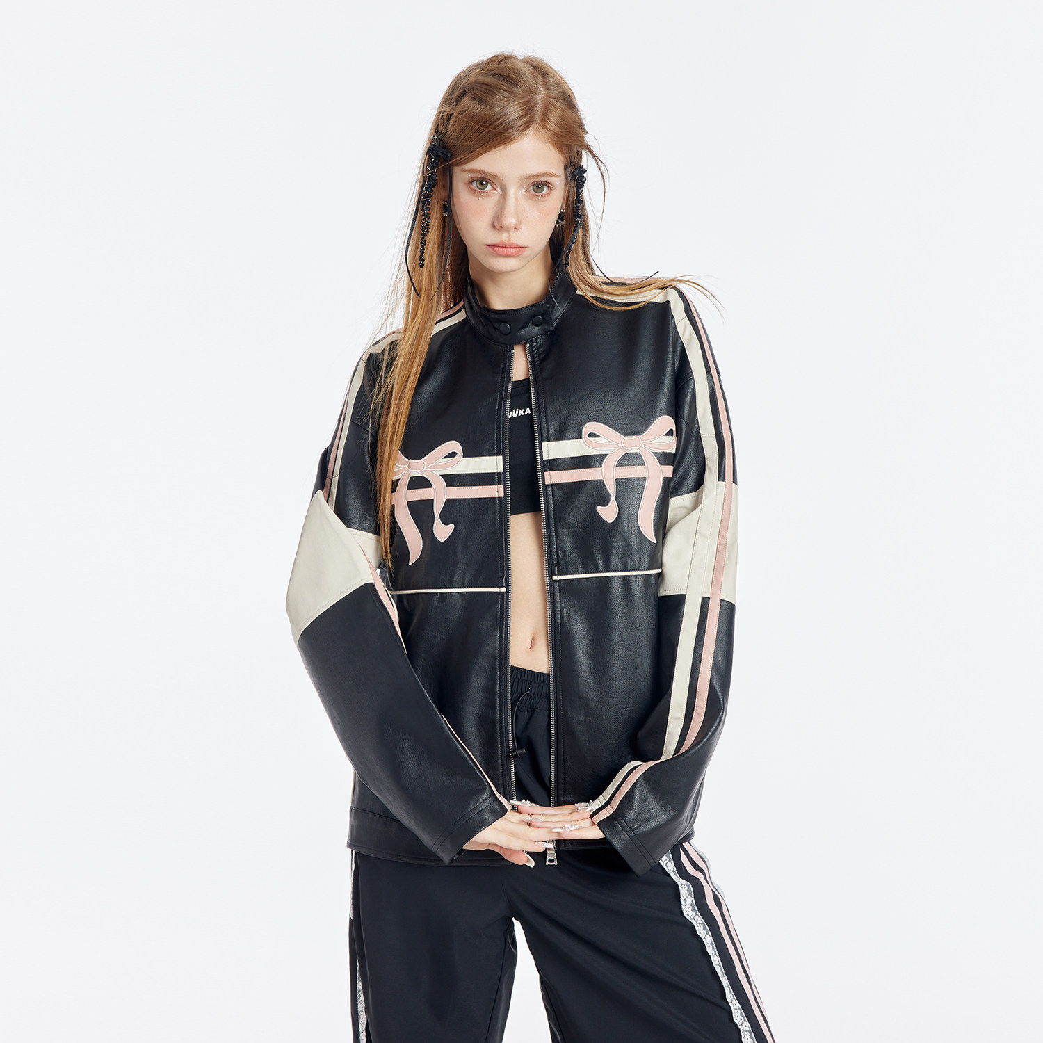 GUUKAHERO黑粉蝴蝶结拼色机车PU皮衣夹克女 硬核辣妹复古阔形外套