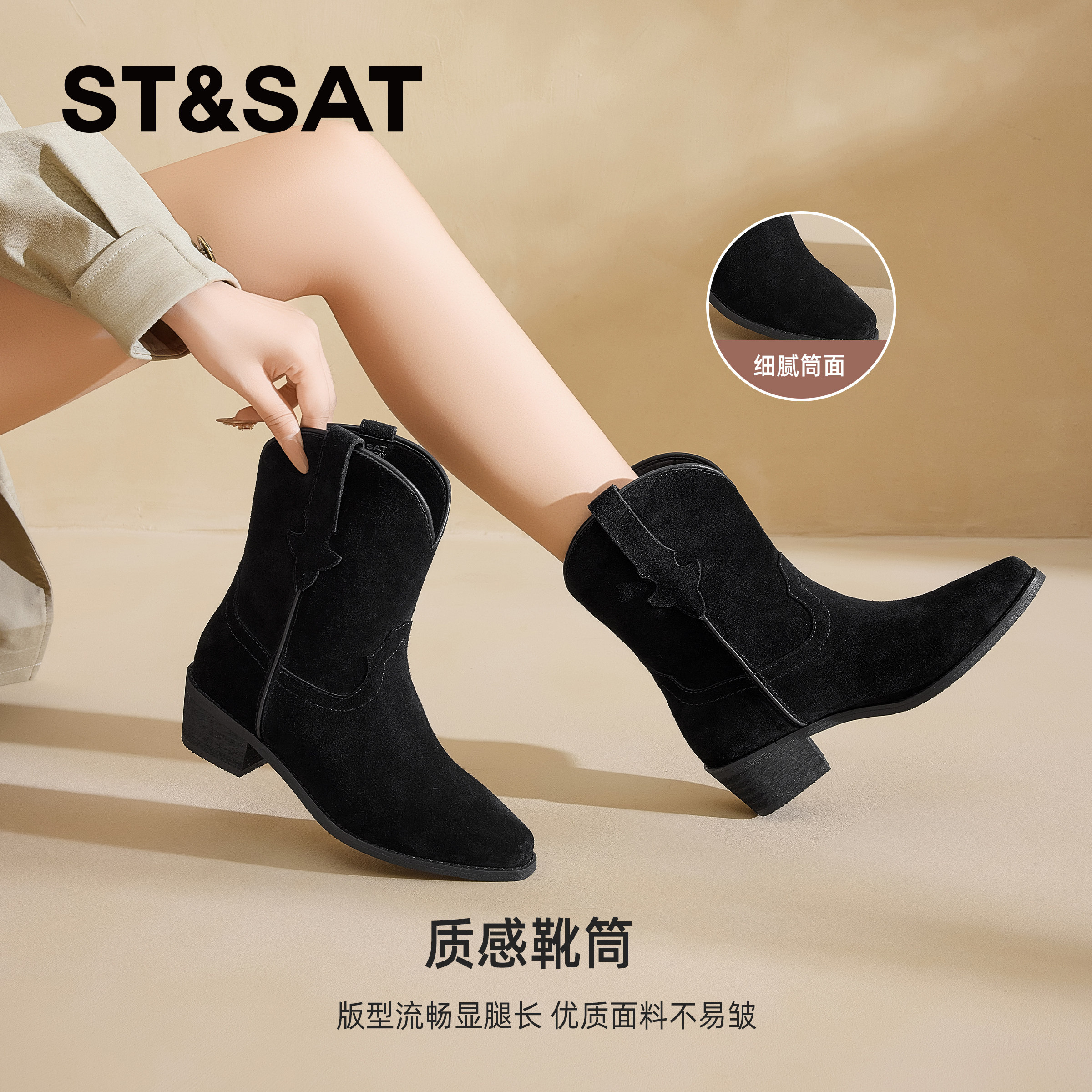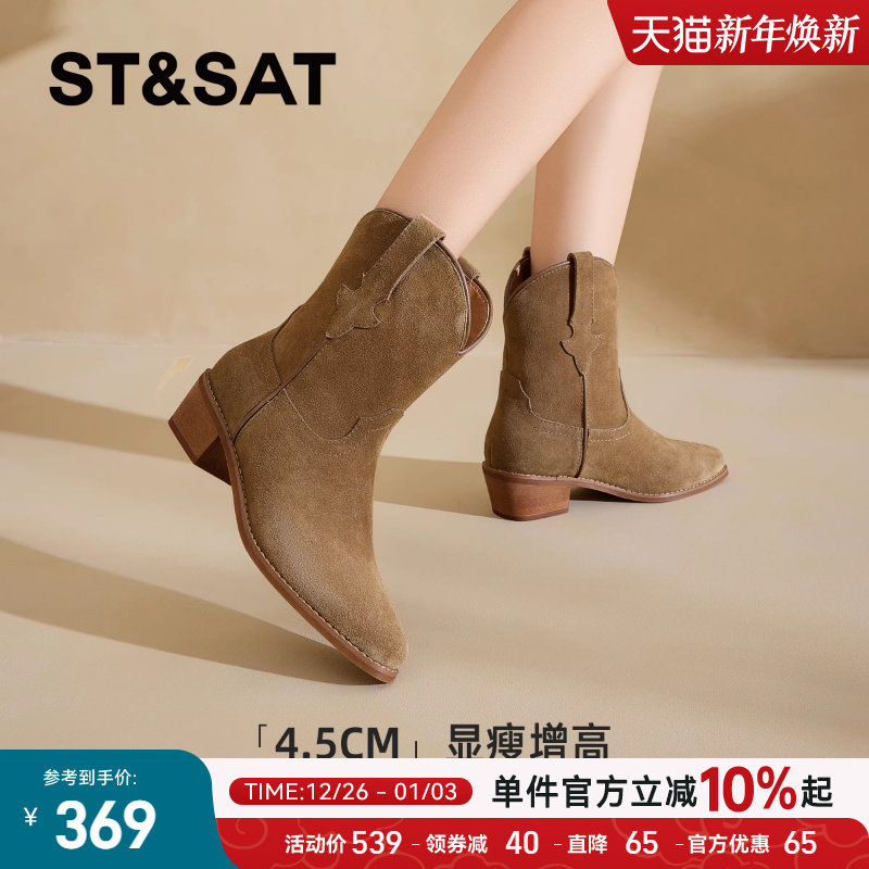 美拉德复古粗跟堆堆西部牛仔靴 新款 真皮 内增高短靴女2025年秋季