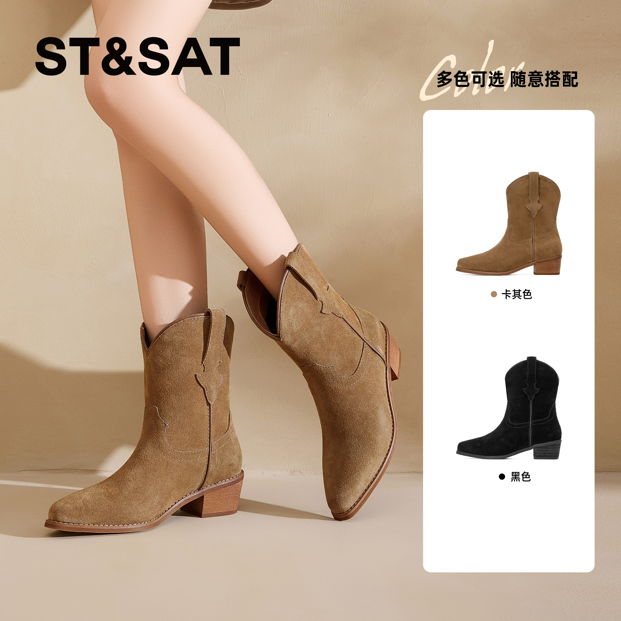 周雨彤同款 百丽女靴周游世界复古美拉德西部靴加绒雪地靴短筒靴