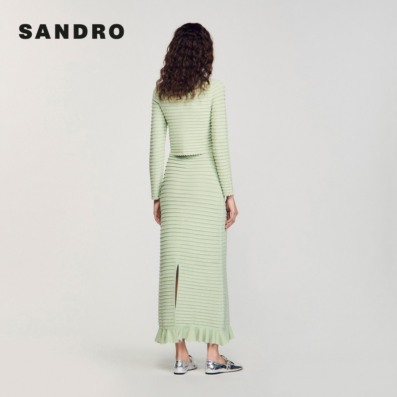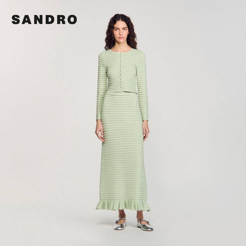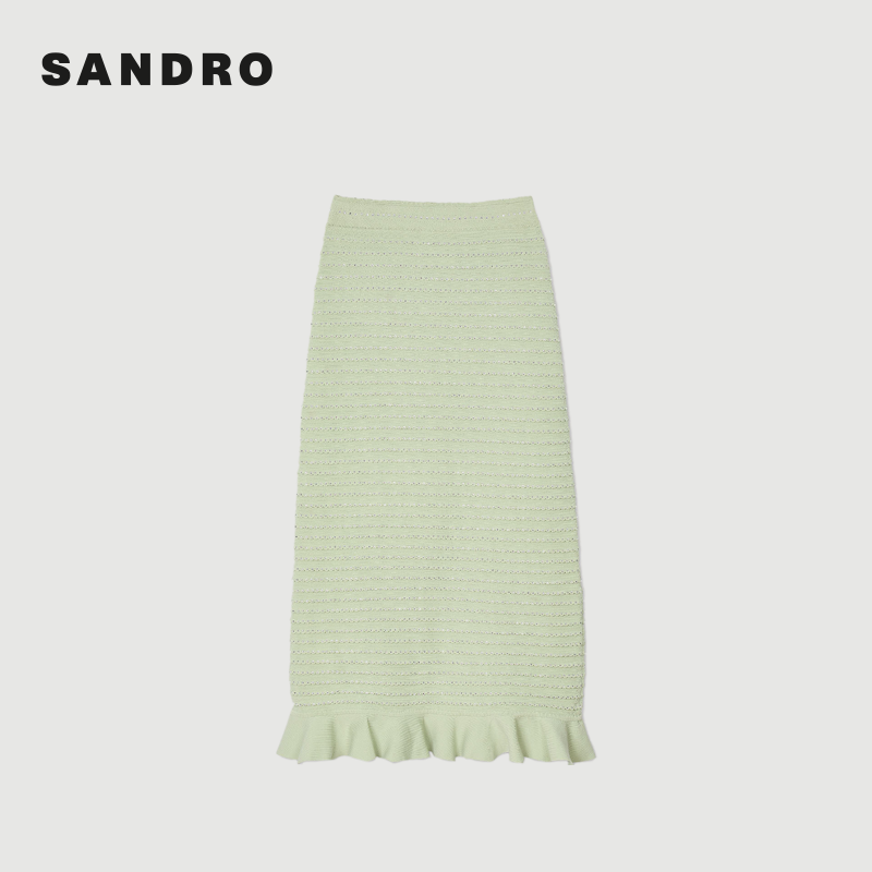 针织半身裙长裙 气质仿钻荷叶边条纹修身 SANDRO2025秋冬女装 法式