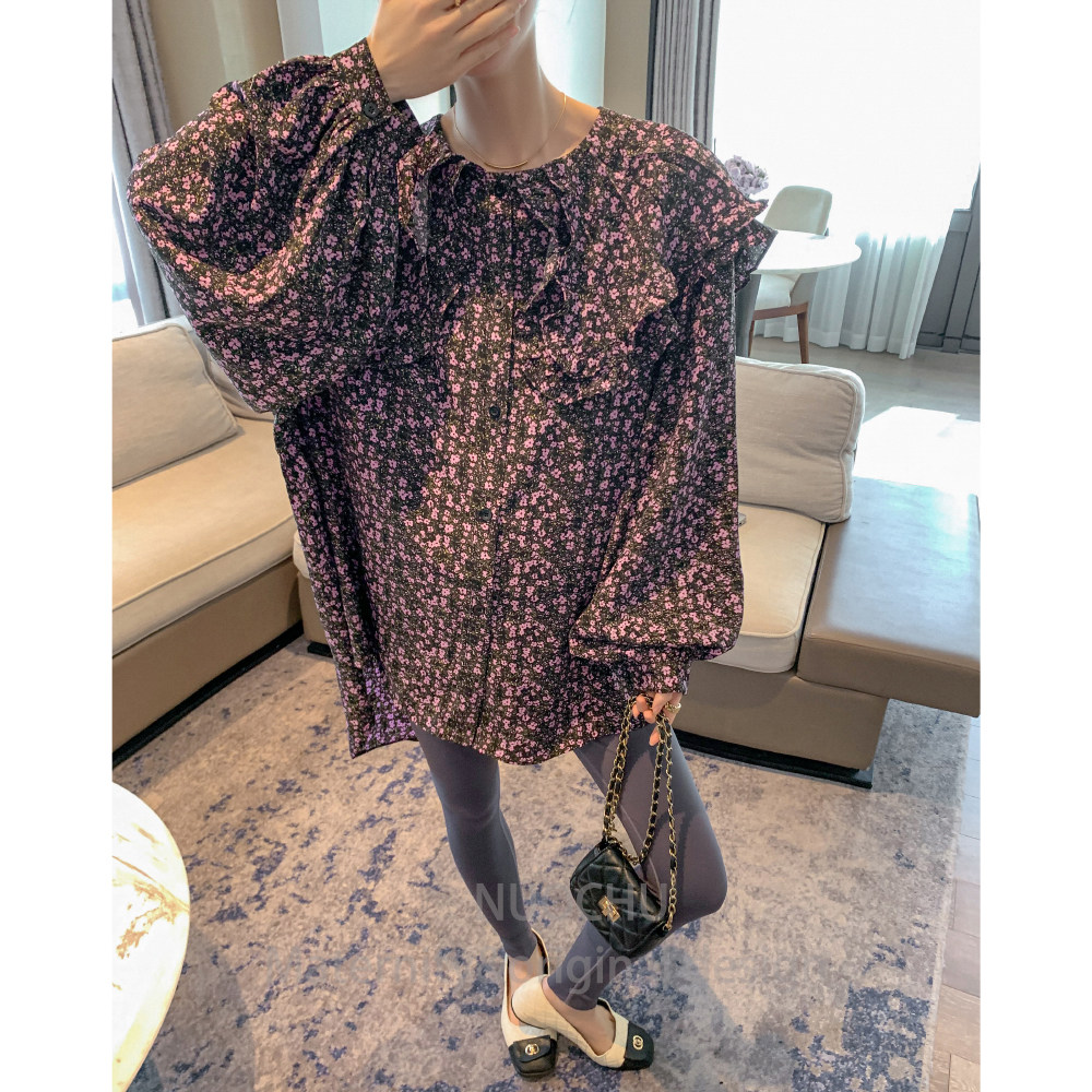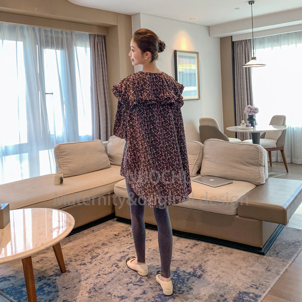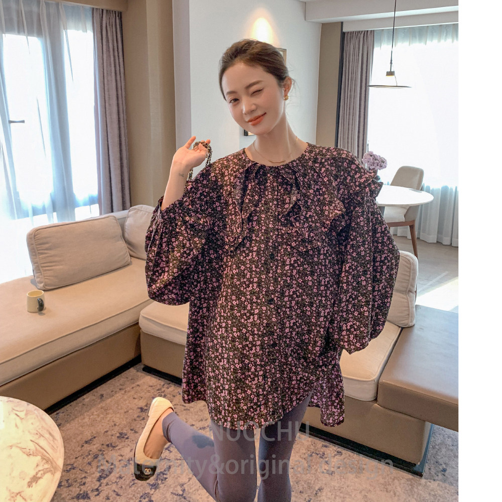 法式 诺初孕妇装 女秋季 碎花娃娃领雪纺衬衫 木耳边衬衣小众上衣 秋款