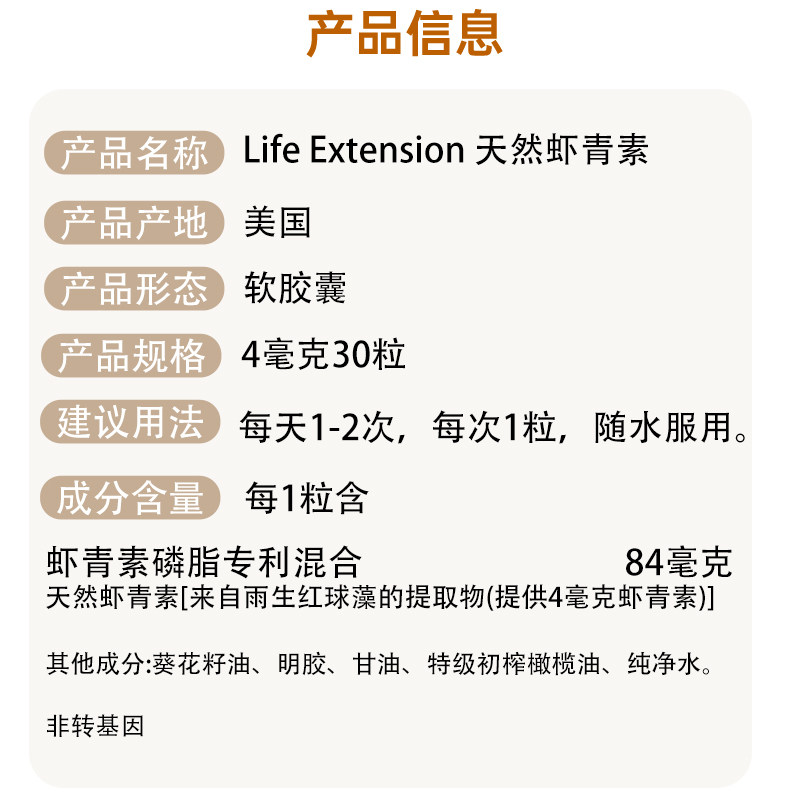 天然虾青素雨生红球藻Astaxanthin易吸收 Extension 美国直邮Life