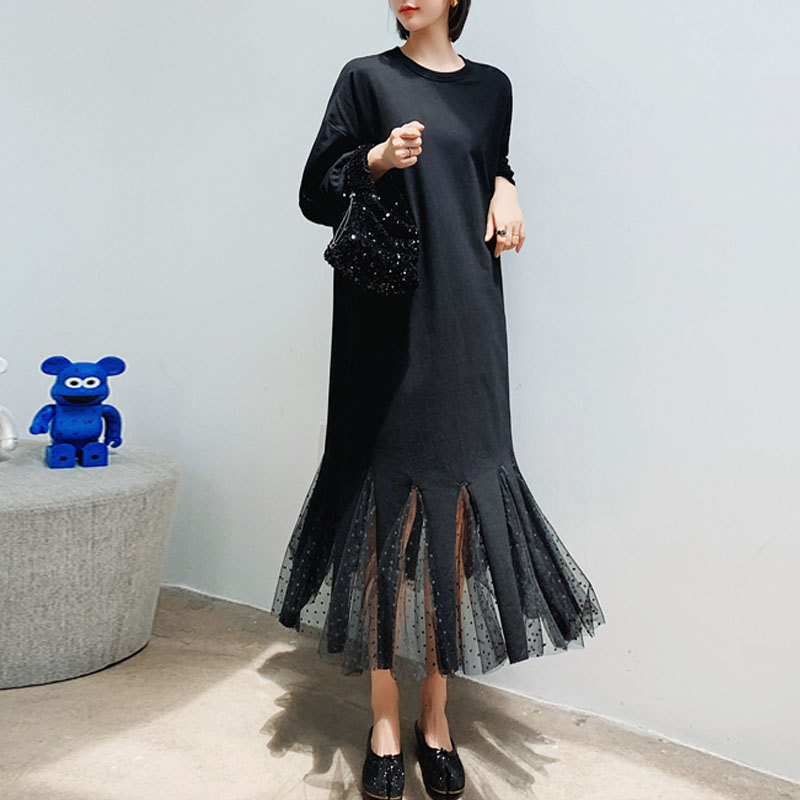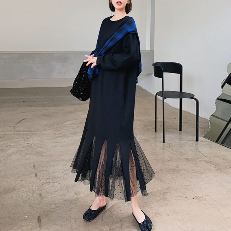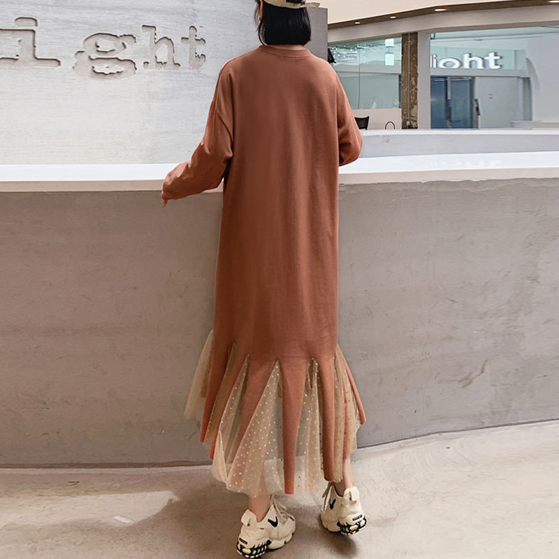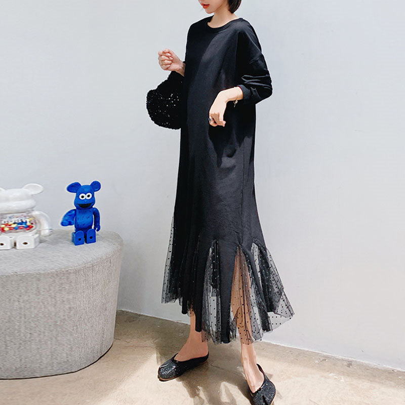大版 秋冬季 过膝宽松大码 卫衣女超长款 鱼尾连衣裙长裙 拼接网纱长袖