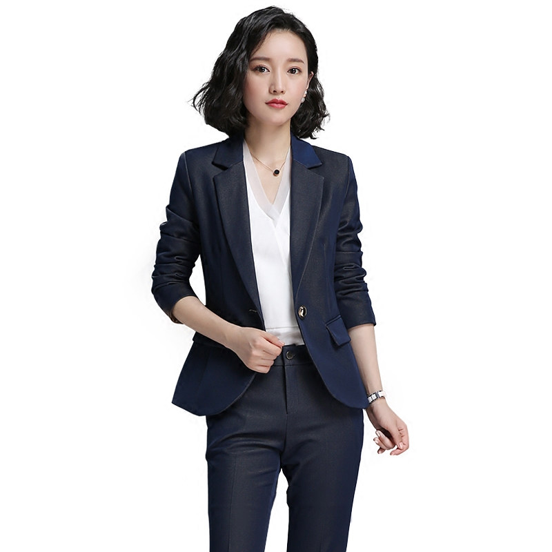 两件套小个子高级气质职业装 芝美日禾 女裤 套装 午夜蓝双排扣西装