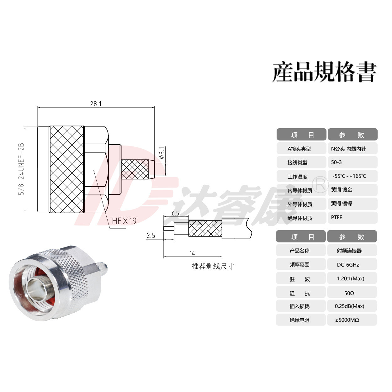 8.5GHZ 3公压接高频款 N型公头内螺纹内针 接RG142 223等 195