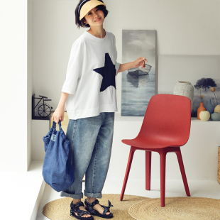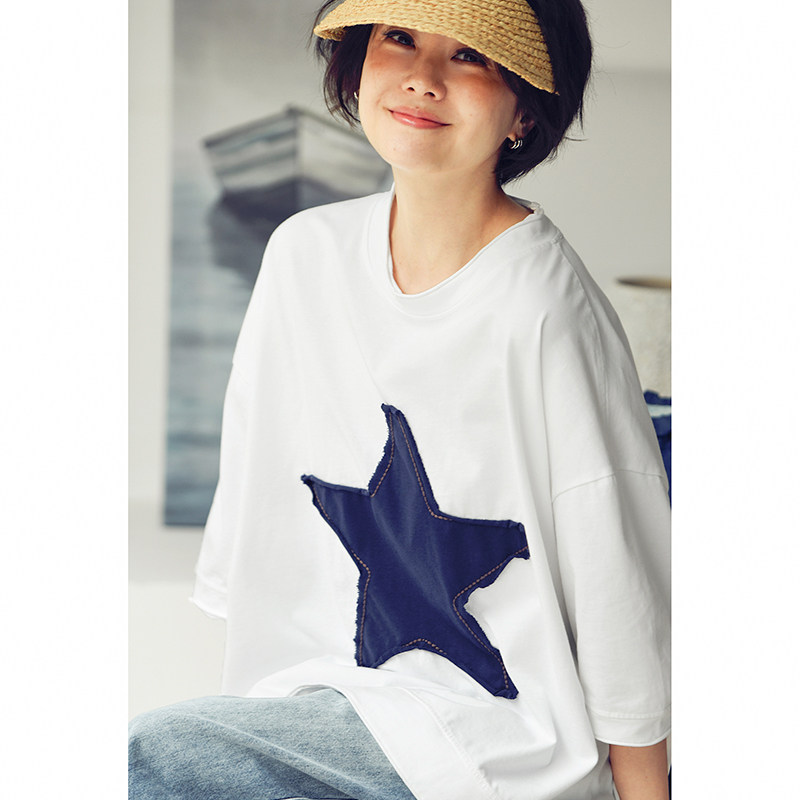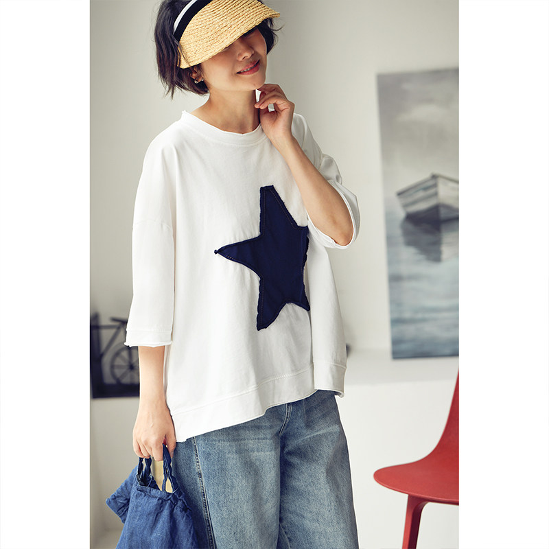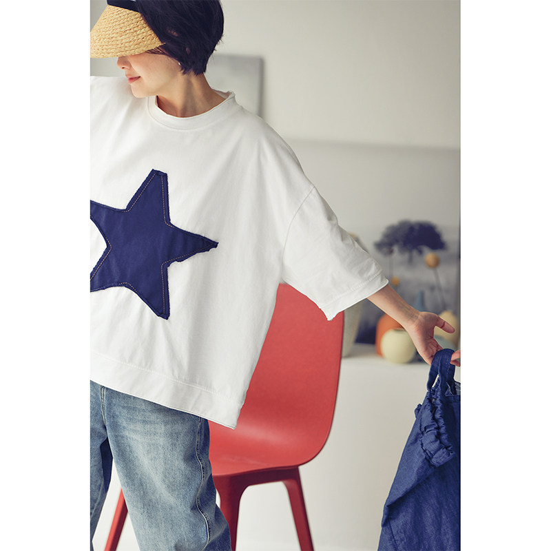 文艺休闲撞色五角星贴布宽松舒适oversize短袖 T6713C T恤女春 包邮