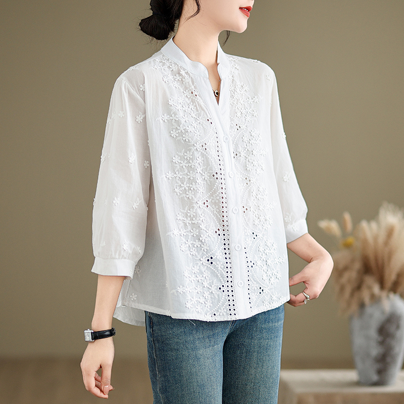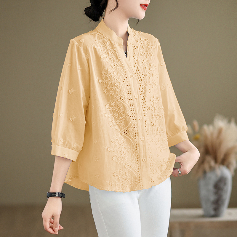 设计感上衣 衬衫 文艺V领洋气质百搭宽松棉麻纯色显瘦休闲半袖 女装