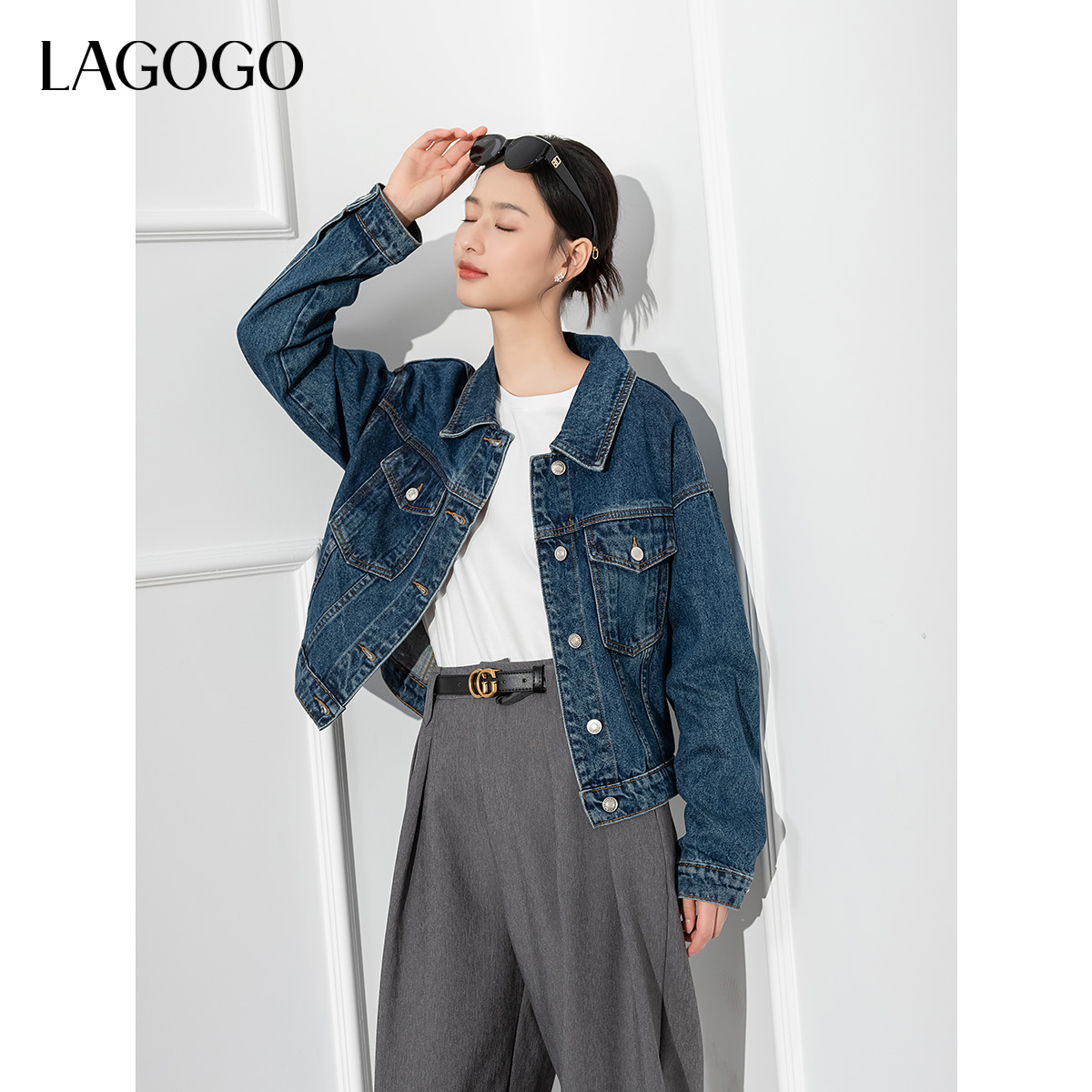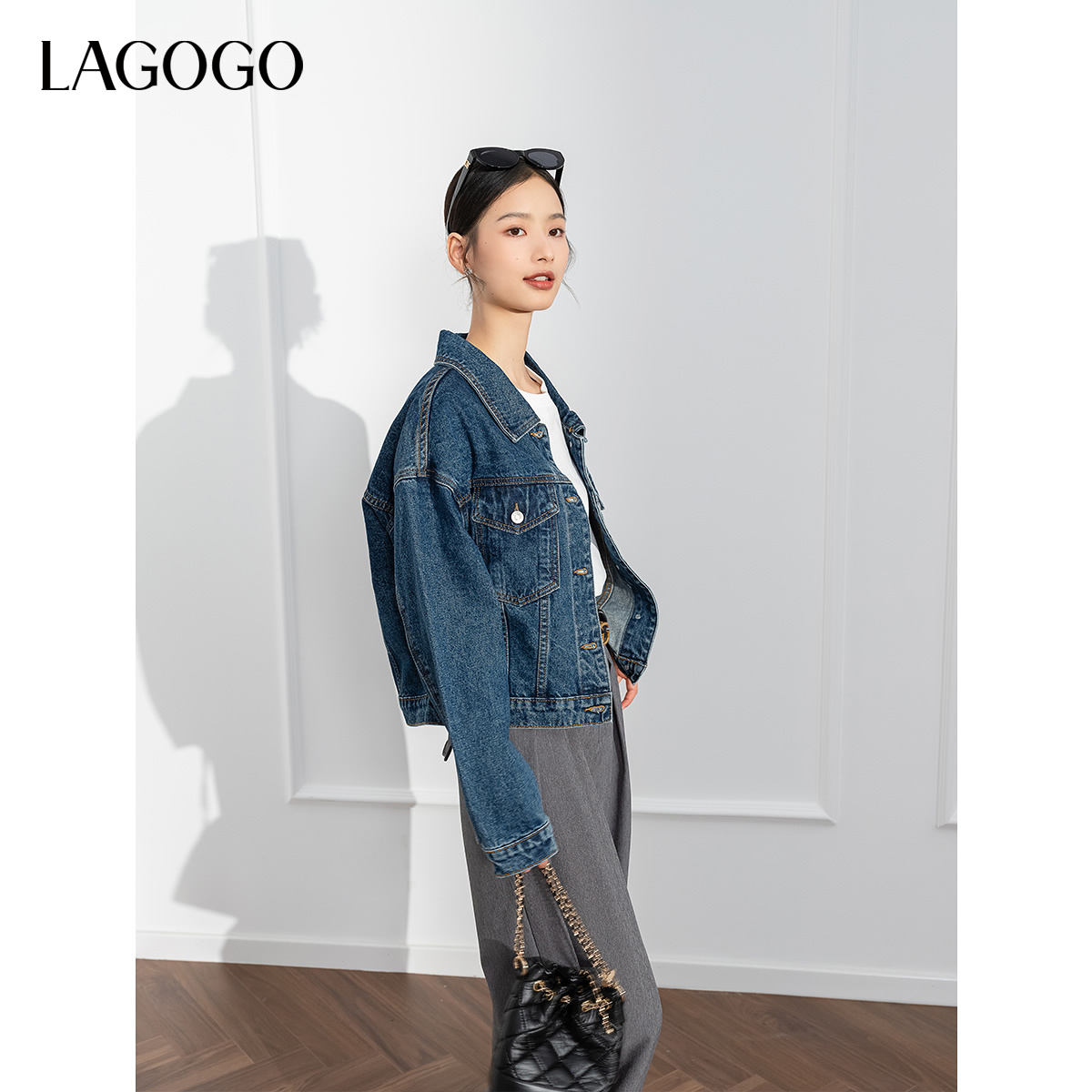 复古宽松休闲上衣 美式 LAGOGO短款 翻领牛仔外套女拉谷谷春秋新款