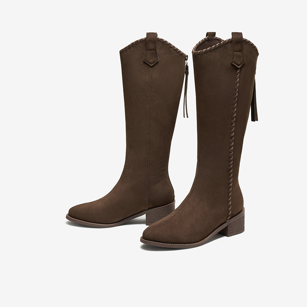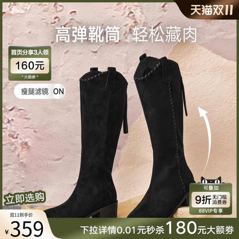 百思图2025冬季 绒面骑士靴长靴V口粗跟女西部靴F3016DG5 商场新款