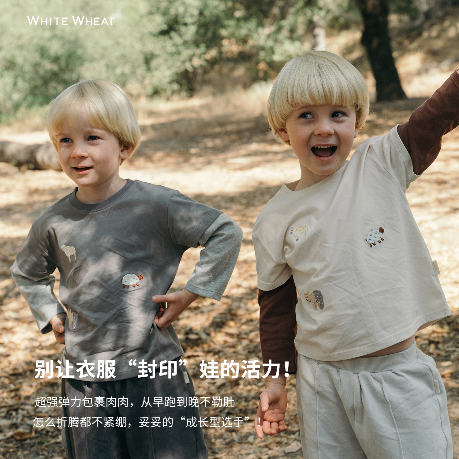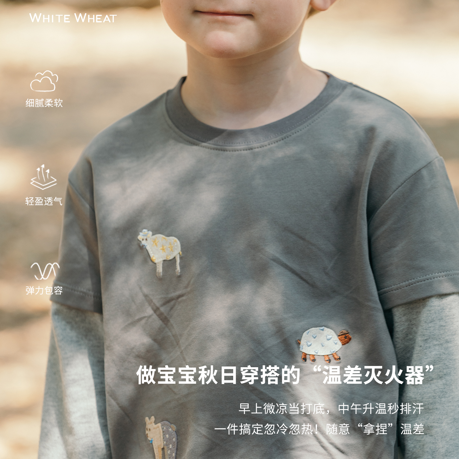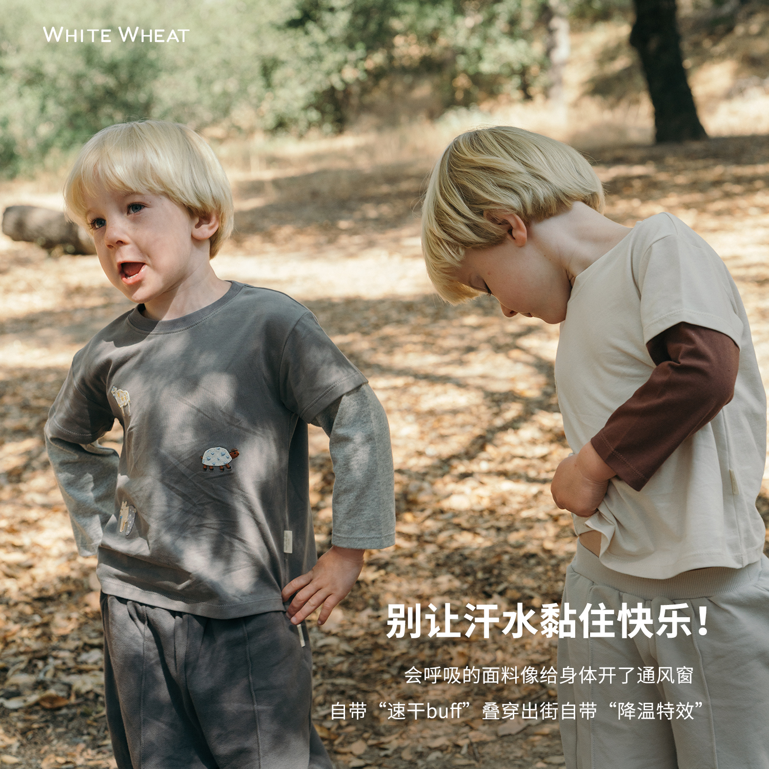 纯棉百搭男孩T恤 上衣假两件女童长袖 whitewheat儿童2025秋季 新款