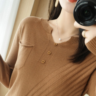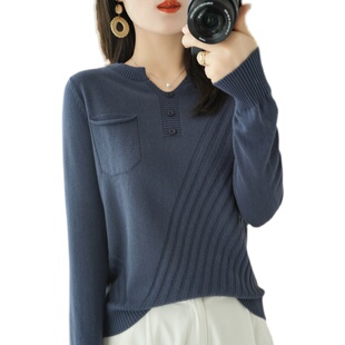 毛衣外穿上衣宽松 t恤女打底长袖 100纯棉V领棉麻针织衫 女2022秋季