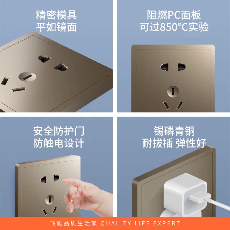 正品 开关插座四孔七孔五孔带开关六类千兆网络插座 飞雕流光金新款