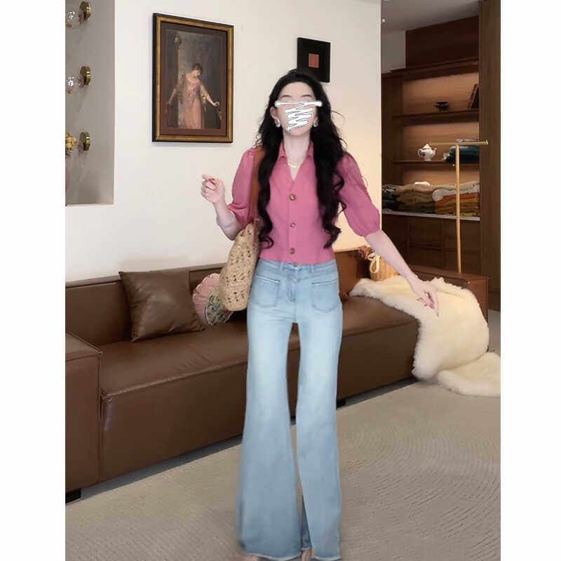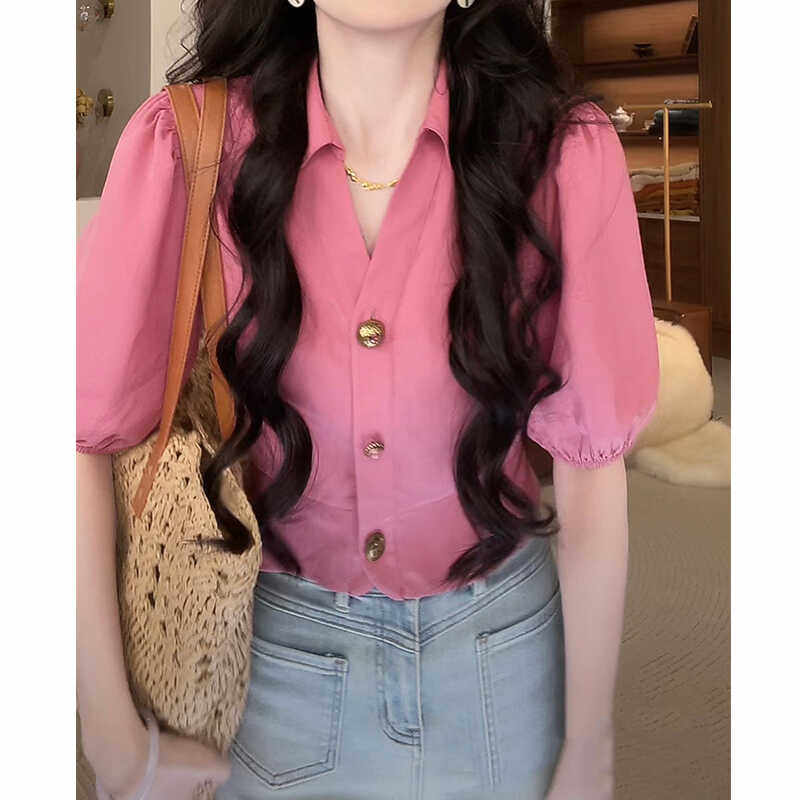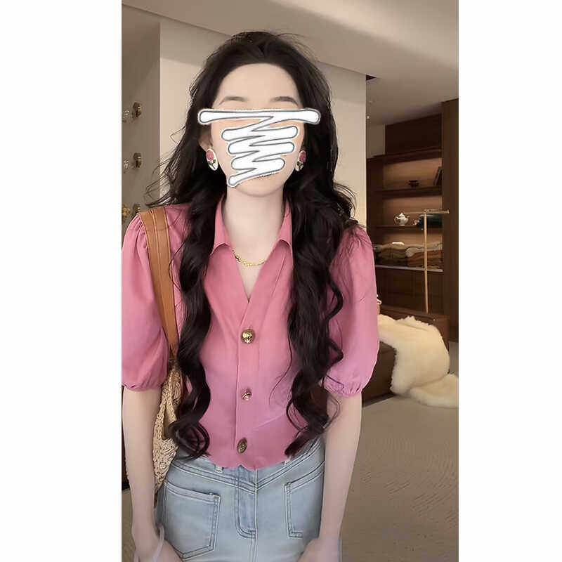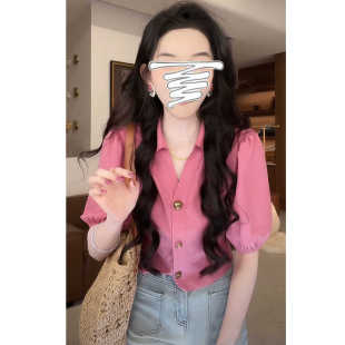 女士夏季 衬衫 独特别致漂亮宽松雪纺上衣 气质小众粉色翻领短袖 法式