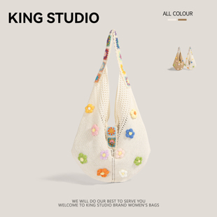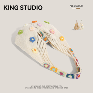 花朵棉线编织包包女2025新款 潮夏天大容量单肩包松弛感度假沙滩包