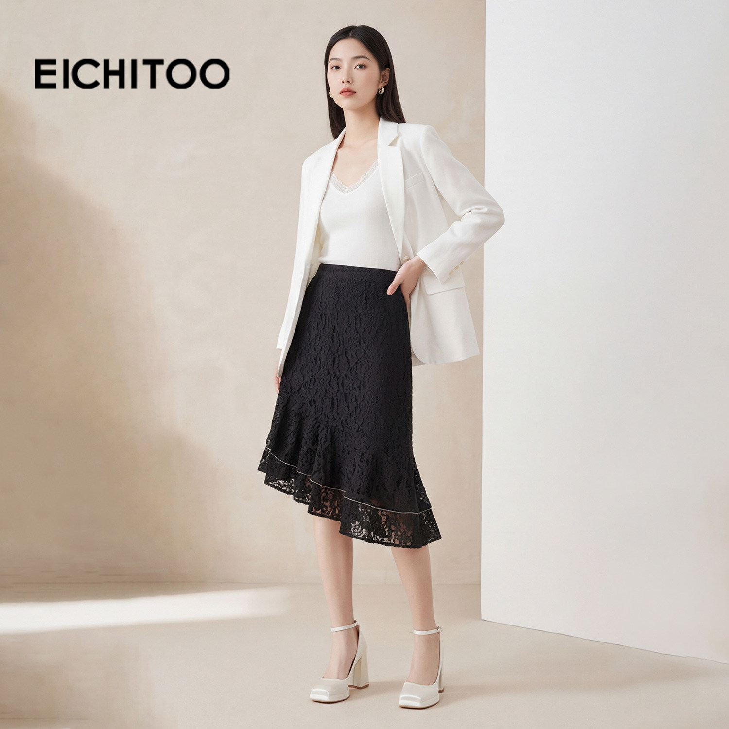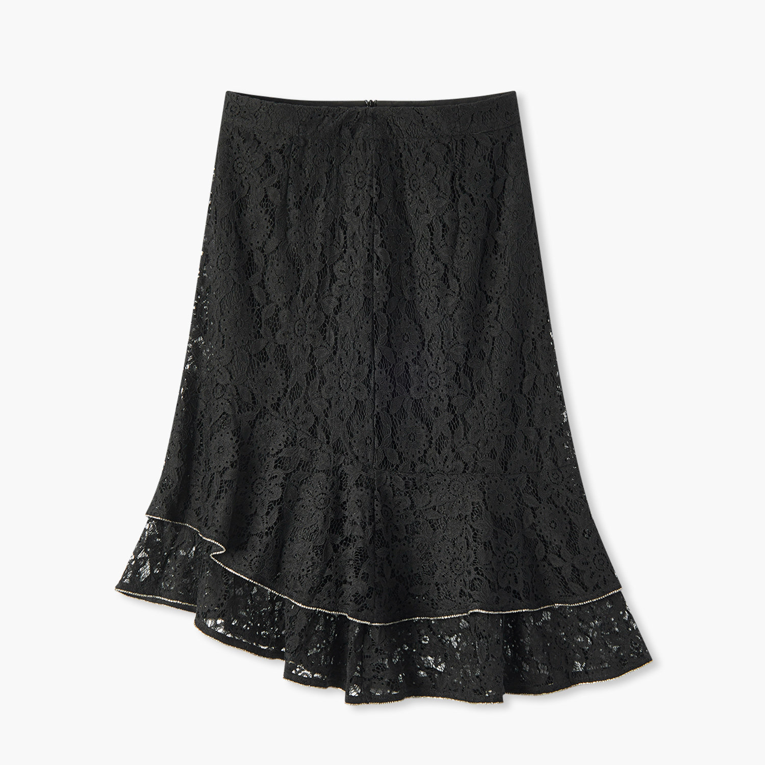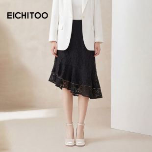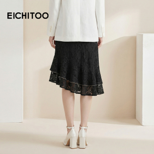 爱居兔黑色鱼尾半身裙女春秋新款 中长高腰蕾丝包臀裙单裙