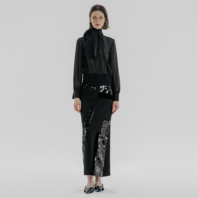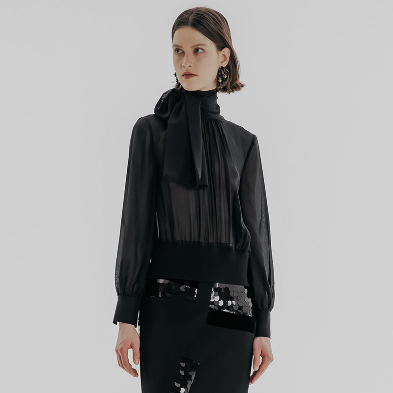 HUI卉桑蚕丝雪纺细微打褶祥云景泰蓝圆扣透视设计飘带领女士衬衫