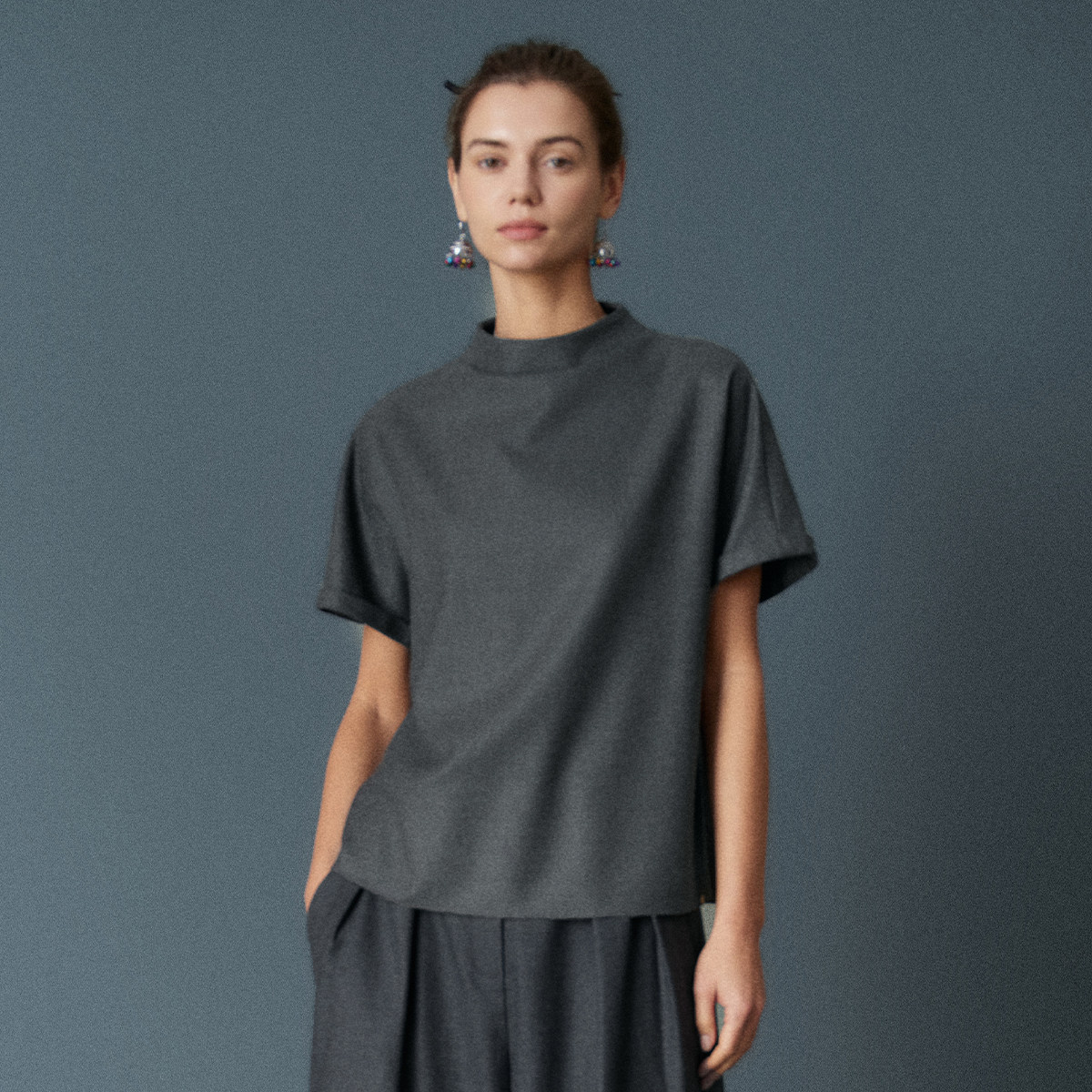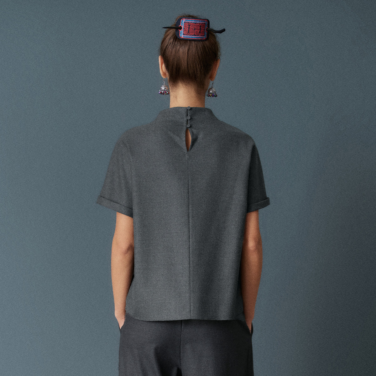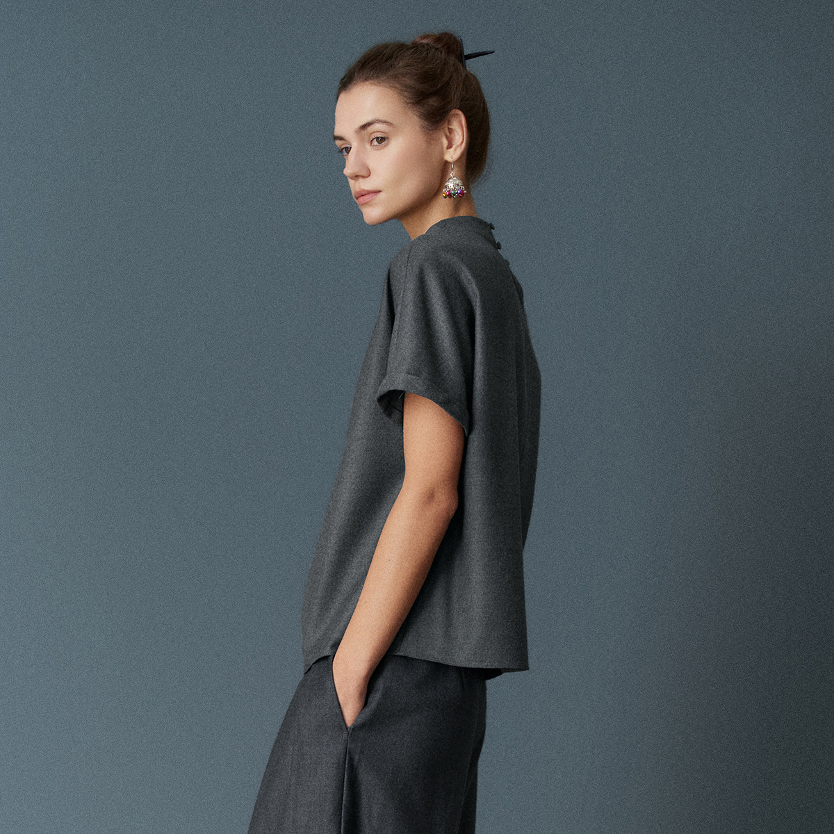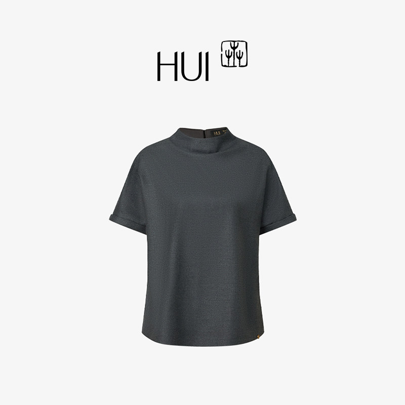 短袖 型新中式 百搭优雅上衣 立领H版 HUI卉粗斜纹精纺羊毛层叠衣袖