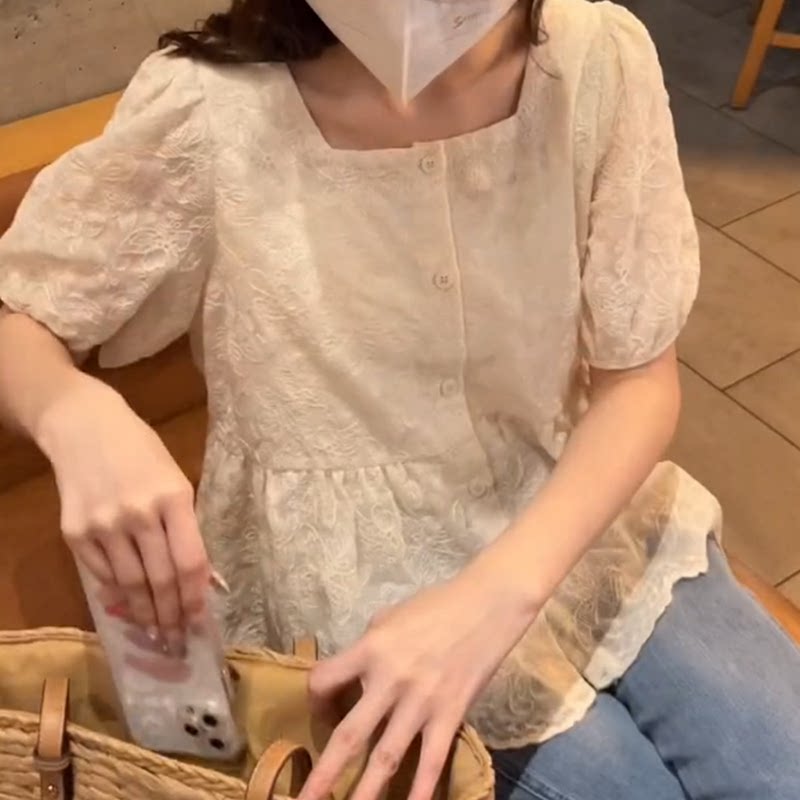 蕾丝刺绣高级感娃娃衫 雪纺衬衫 泡泡袖 遮肚女夏新款 薄 上衣洋气小衫